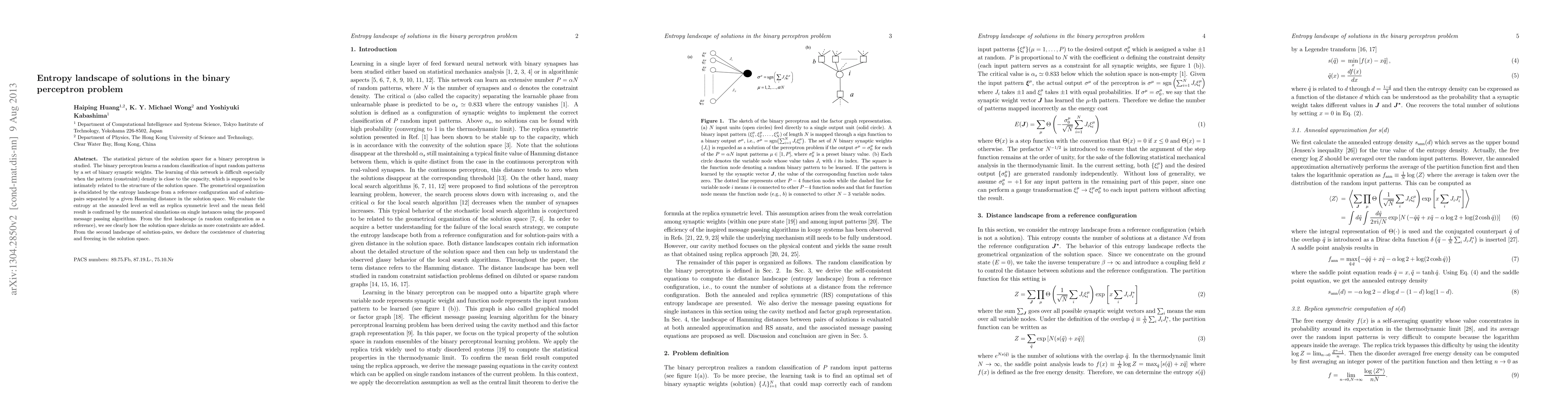This paper investigates the entropy landscape of the binary perceptron problem, revealing the shrinking solution space as constraints increase and the coexistence of clustering and freezing in the solution space, confirmed by numerical simulations and message passing algorithms.