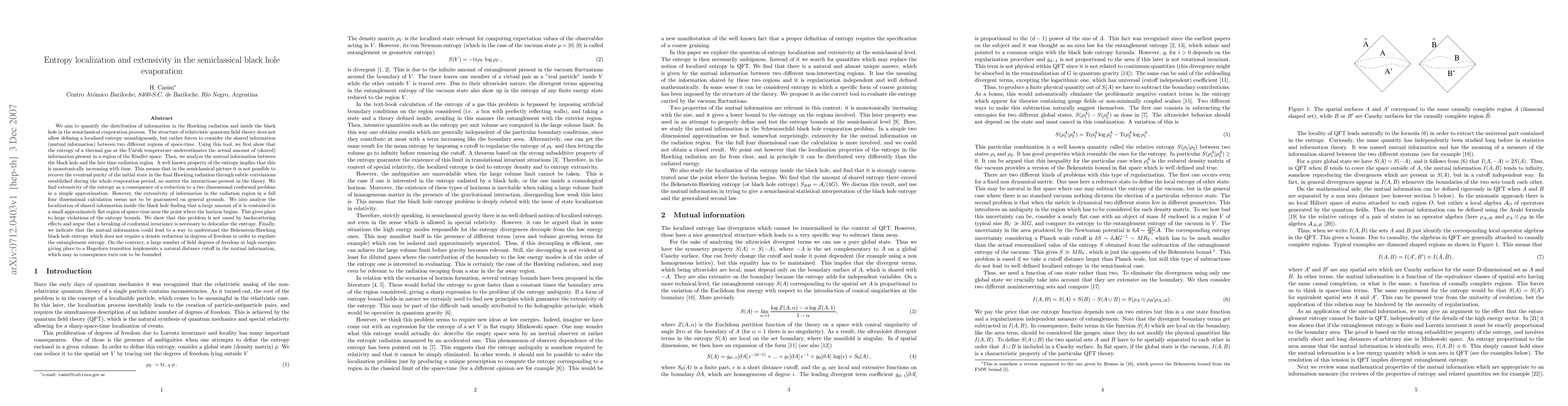 This paper investigates the distribution and extensivity of information in semiclassical black hole evaporation, revealing that mutual information between the black hole and Hawking radiation cannot restore the initial state's purity. It finds extensive entropy in a simplified approximation but not in full four-dimensional calculations, highlighting significant entropy localization near the horizon and suggesting a need for conformal invariance breaking to delocalize entropy.
