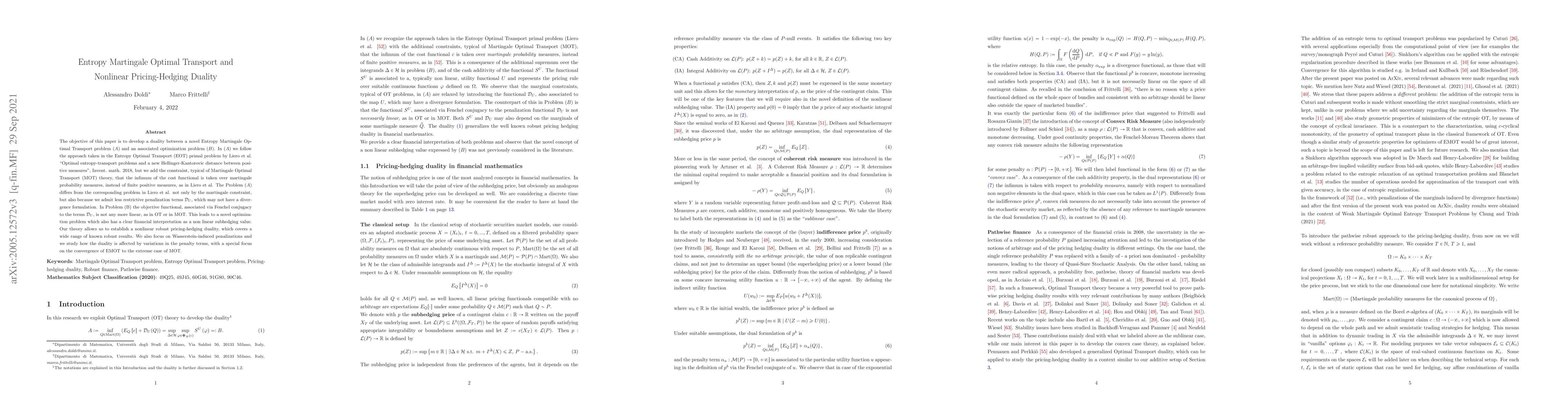 The objective of this paper is to develop a duality between a novel Entropy Martingale Optimal Transport problem (A) and an associated optimization problem (B). In (A) we follow the approach taken in the Entropy Optimal Transport (EOT) primal problem by Liero et al. "Optimal entropy-transport problems and a new Hellinger-Kantorovic distance between positive measures", Invent. math. 2018, but we add the constraint, typical of Martingale Optimal Transport (MOT) theory, that the infimum of the cost functional is taken over martingale probability measures, instead of finite positive measures, as in Liero et al.. The Problem (A) differs from the corresponding problem in Liero et al. not only by the martingale constraint, but also because we admit less restrictive penalization terms $\mathcal{D}_{U}$, which may not have a divergence formulation. In Problem (B) the objective functional, associated via Fenchel conjugacy to the terms $\mathcal{D}_{U}$, is not any more linear, as in OT or in MOT. This leads to a novel optimization problem which also has a clear financial interpretation as a nonlinear subhedging value. Our theory allows us to establish a nonlinear robust pricing-hedging duality, which covers a wide range of known robust results. We also focus on Wasserstein-induced penalizations and we study how the duality is affected by variations in the penalty terms, with a special focus on the convergence of EMOT to the extreme case of MOT.