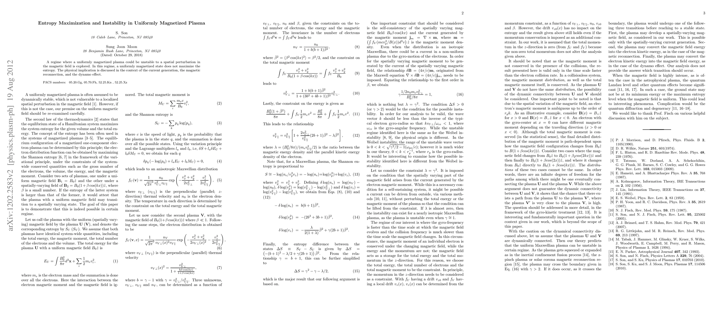 A regime where a uniformly magnetized plasma could be unstable to a spatial perturbation in the magnetic field is explored. In this regime, a uniformly magnetized state does not maximize the entropy. The physical implication is discussed in the context of the current generation, the magnetic reconnection, and the dynamo effect.