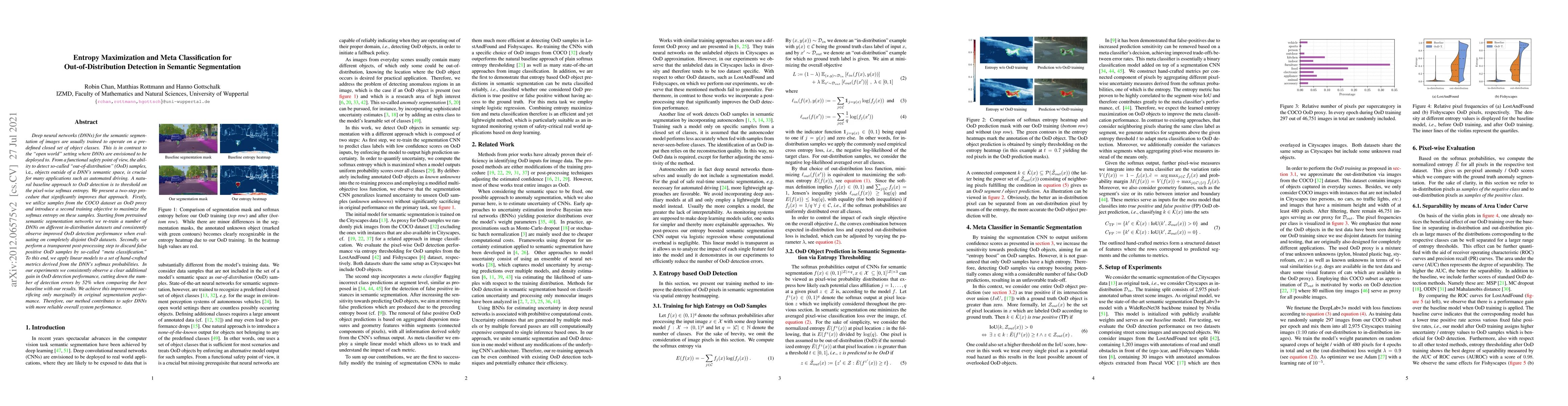 Deep neural networks (DNNs) for the semantic segmentation of images are usually trained to operate on a predefined closed set of object classes. This is in contrast to the "open world" setting where DNNs are envisioned to be deployed to. From a functional safety point of view, the ability to detect so-called "out-of-distribution" (OoD) samples, i.e., objects outside of a DNN's semantic space, is crucial for many applications such as automated driving. A natural baseline approach to OoD detection is to threshold on the pixel-wise softmax entropy. We present a two-step procedure that significantly improves that approach. Firstly, we utilize samples from the COCO dataset as OoD proxy and introduce a second training objective to maximize the softmax entropy on these samples. Starting from pretrained semantic segmentation networks we re-train a number of DNNs on different in-distribution datasets and consistently observe improved OoD detection performance when evaluating on completely disjoint OoD datasets. Secondly, we perform a transparent post-processing step to discard false positive OoD samples by so-called "meta classification". To this end, we apply linear models to a set of hand-crafted metrics derived from the DNN's softmax probabilities. In our experiments we consistently observe a clear additional gain in OoD detection performance, cutting down the number of detection errors by up to 52% when comparing the best baseline with our results. We achieve this improvement sacrificing only marginally in original segmentation performance. Therefore, our method contributes to safer DNNs with more reliable overall system performance.