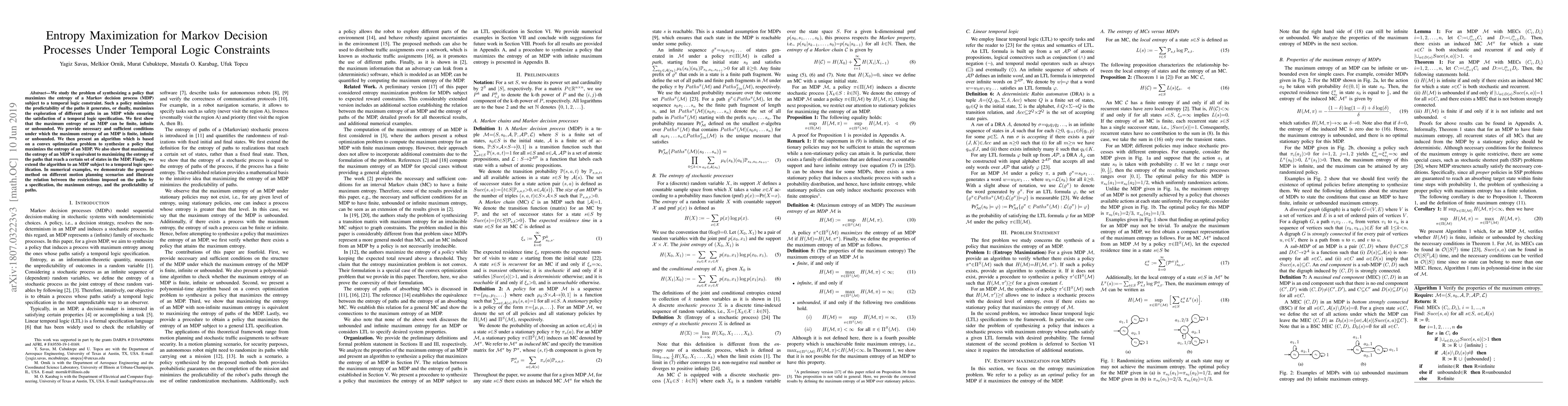 This paper develops an algorithm to synthesize a policy for Markov decision processes (MDPs) that maximizes entropy while satisfying temporal logic constraints, showing that maximizing entropy minimizes path predictability. The authors provide conditions for the finiteness of maximum entropy and demonstrate the method through motion planning examples.