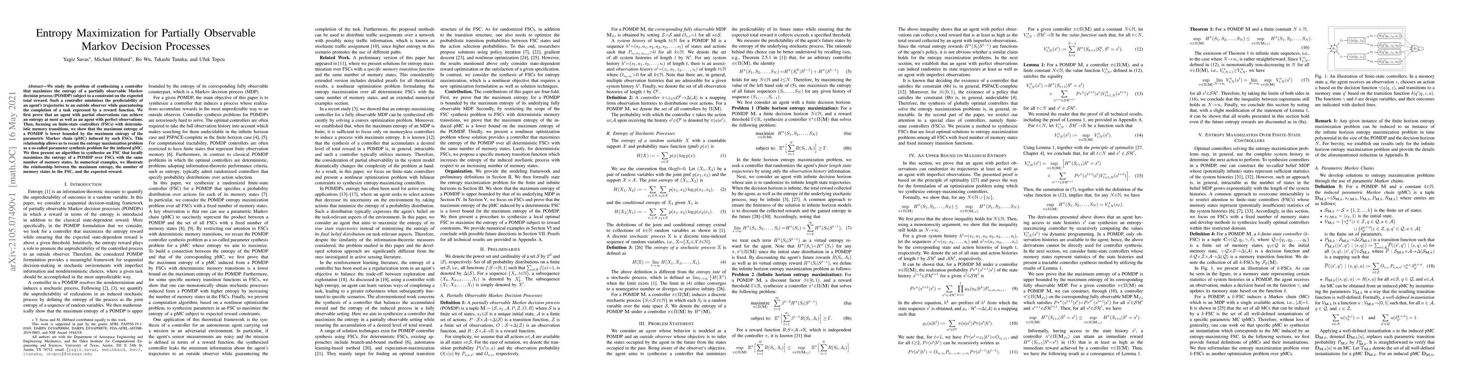 This paper proposes an algorithm to synthesize controllers for partially observable Markov decision processes (POMDPs) that maximize entropy while ensuring task completion through a reward function. It establishes a lower bound for entropy maximization in POMDPs using induced parametric Markov chains and presents a method for finding optimal finite-state controllers.
