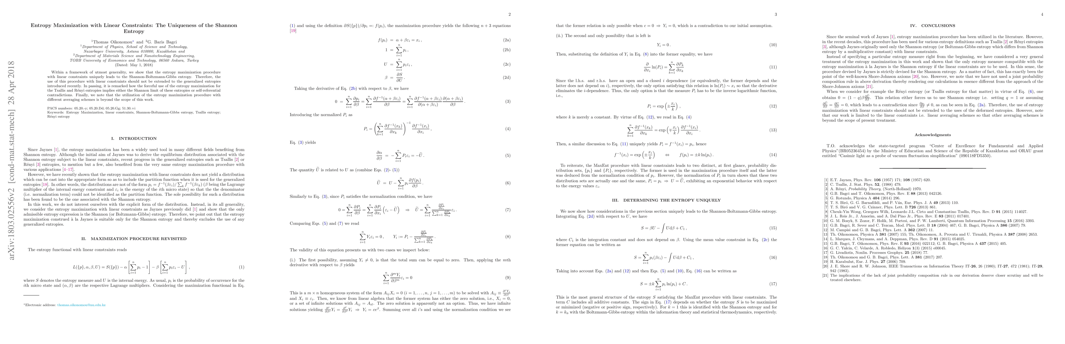 This paper demonstrates that entropy maximization under linear constraints uniquely results in the Shannon entropy, cautioning against its application to generalized entropies like Tsallis and Rényi, which either revert to Shannon entropy or lead to contradictions. The study does not address entropy maximization with different averaging schemes.
