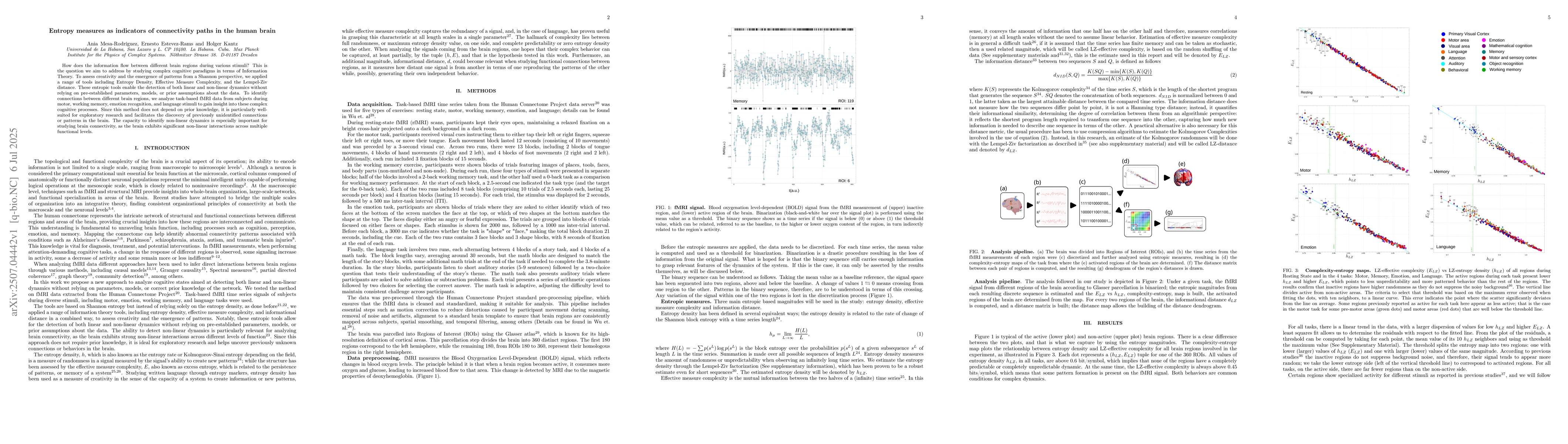 How does the information flow between different brain regions during various stimuli? This is the question we aim to address by studying complex cognitive paradigms in terms of Information Theory. To assess creativity and the emergence of patterns from a Shannon perspective, we applied a range of tools, including Entropy Density, Effective Measure Complexity, and the Lempel-Ziv distance. These entropic tools enable the detection of both linear and non-linear dynamics without relying on pre-established parameters, models, or prior assumptions about the data. To identify connections between different brain regions, we analyse task-based fMRI data from subjects during motor, working memory, emotion recognition, and language stimuli to gain insight into these complex cognitive processes. Since this method does not rely on prior knowledge, it is particularly well-suited for exploratory research, facilitating the discovery of previously unidentified connections or patterns in the brain. The capacity to identify non-linear dynamics is especially important for studying brain connectivity, as the brain exhibits significant non-linear interactions across multiple functional levels.