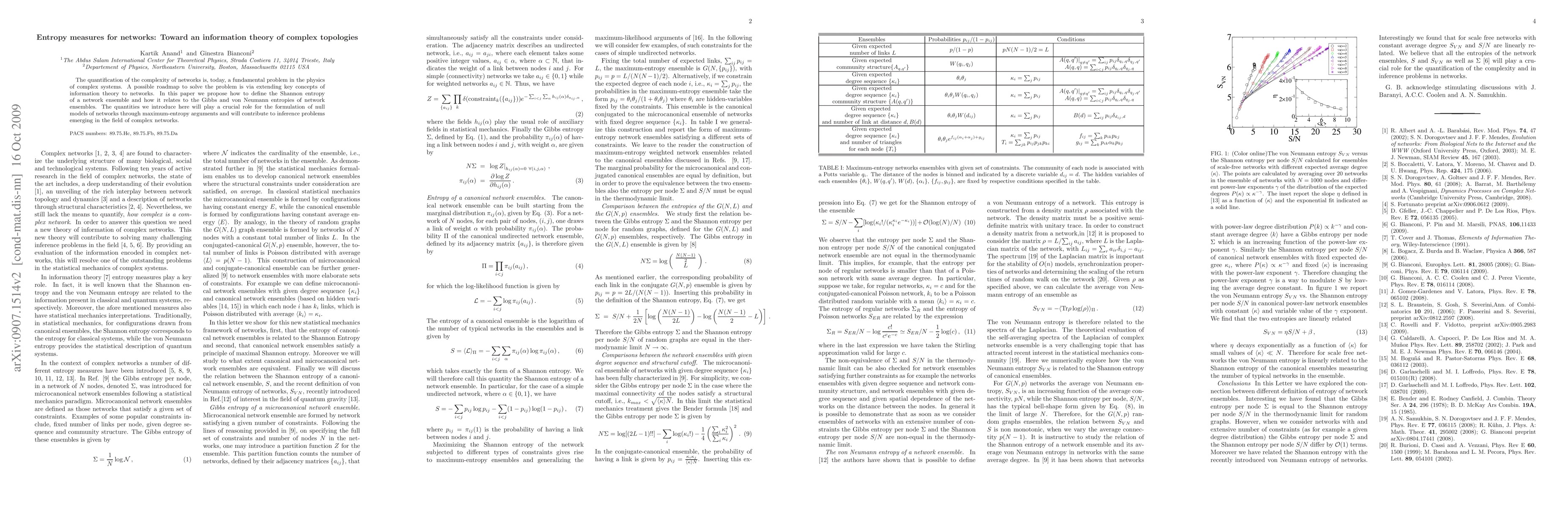 This paper proposes new entropy measures for complex networks, extending information theory concepts to quantify network complexity. The introduced Shannon, Gibbs, and von Neumann entropies will aid in formulating null models and solving inference problems in complex network analysis.
