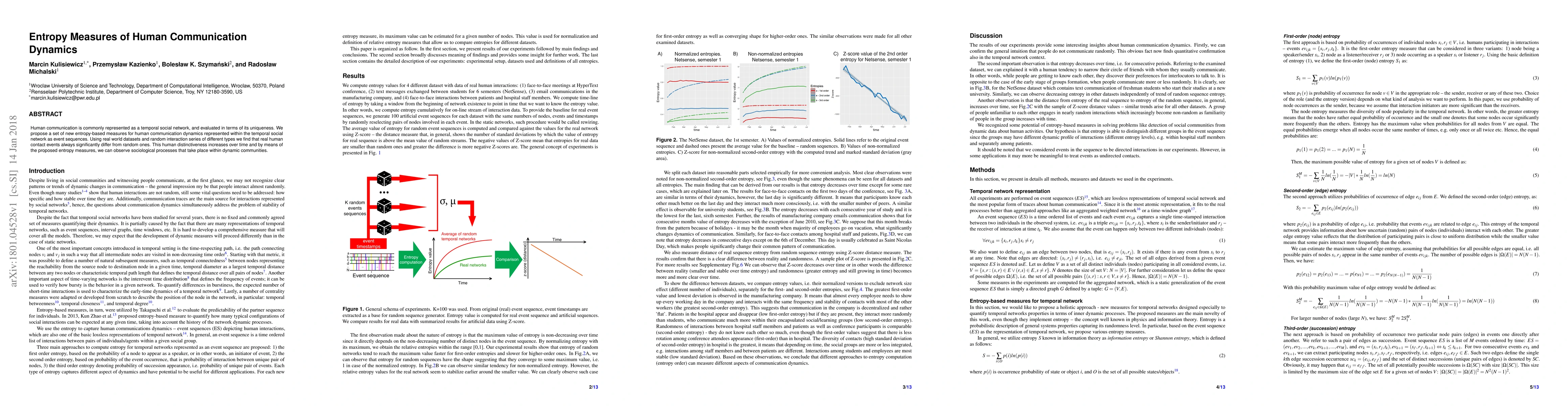 Human communication is commonly represented as a temporal social network, and evaluated in terms of its uniqueness. We propose a set of new entropy-based measures for human communication dynamics represented within the temporal social network as event sequences. Using real world datasets and random interaction series of different types we find that real human contact events always significantly differ from random ones. This human distinctiveness increases over time and by means of the proposed entropy measures, we can observe sociological processes that take place within dynamic communities.