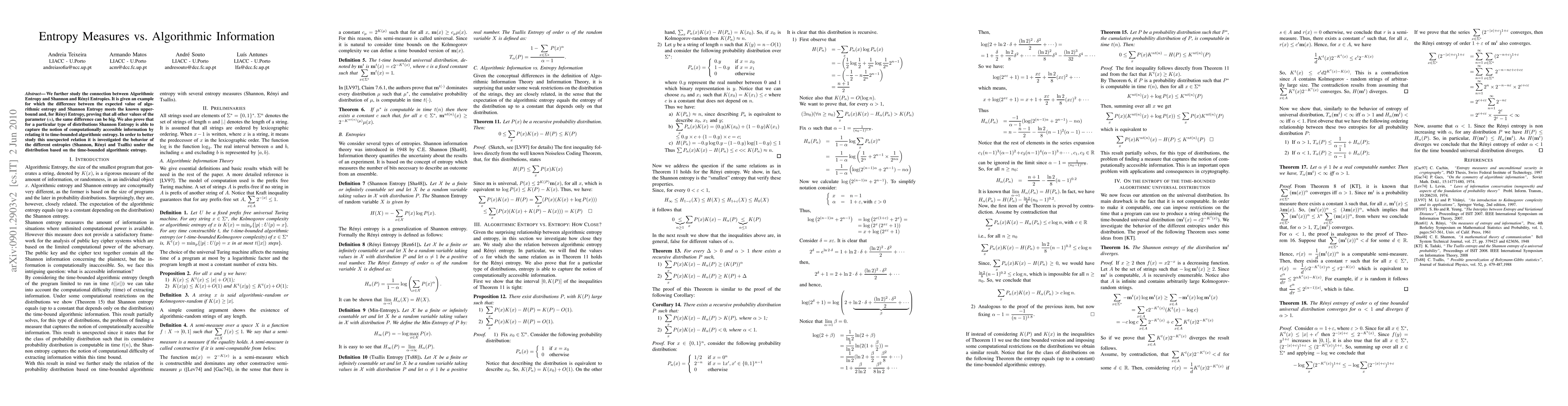 Algorithmic entropy and Shannon entropy are two conceptually different information measures, as the former is based on size of programs and the later in probability distributions. However, it is known that, for any recursive probability distribution, the expected value of algorithmic entropy equals its Shannon entropy, up to a constant that depends only on the distribution. We study if a similar relationship holds for R\'{e}nyi and Tsallis entropies of order $\alpha$, showing that it only holds for R\'{e}nyi and Tsallis entropies of order 1 (i.e., for Shannon entropy). Regarding a time bounded analogue relationship, we show that, for distributions such that the cumulative probability distribution is computable in time $t(n)$, the expected value of time-bounded algorithmic entropy (where the alloted time is $nt(n)\log (nt(n))$) is in the same range as the unbounded version. So, for these distributions, Shannon entropy captures the notion of computationally accessible information. We prove that, for universal time-bounded distribution $\m^t(x)$, Tsallis and R\'{e}nyi entropies converge if and only if $\alpha$ is greater than 1.