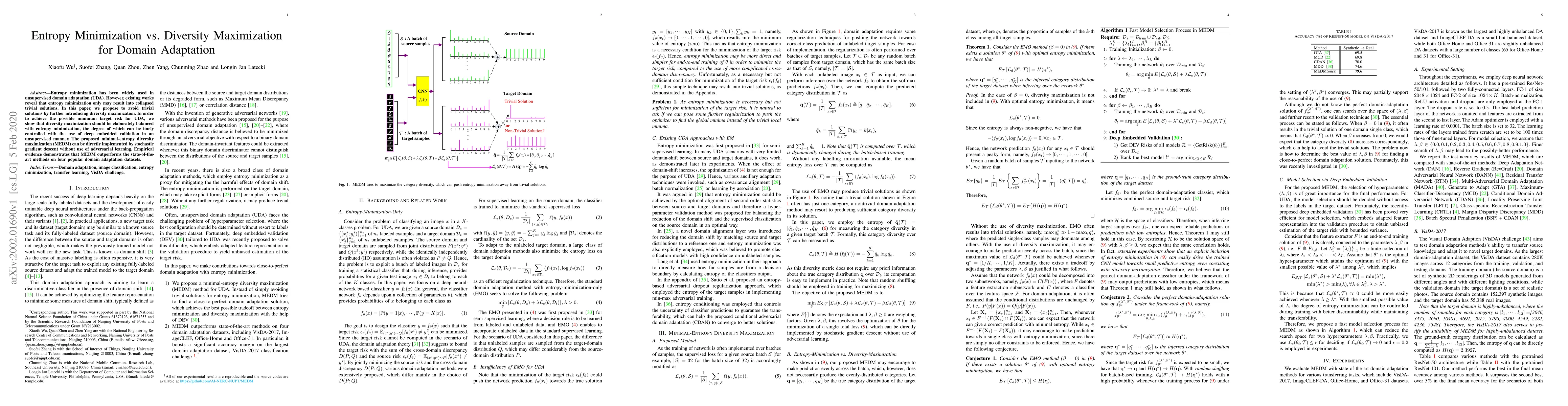 A new approach called minimal-entropy diversity maximization (MEDM) combines entropy minimization with diversity maximization to improve domain adaptation results, outperforming state-of-the-art methods on four datasets.