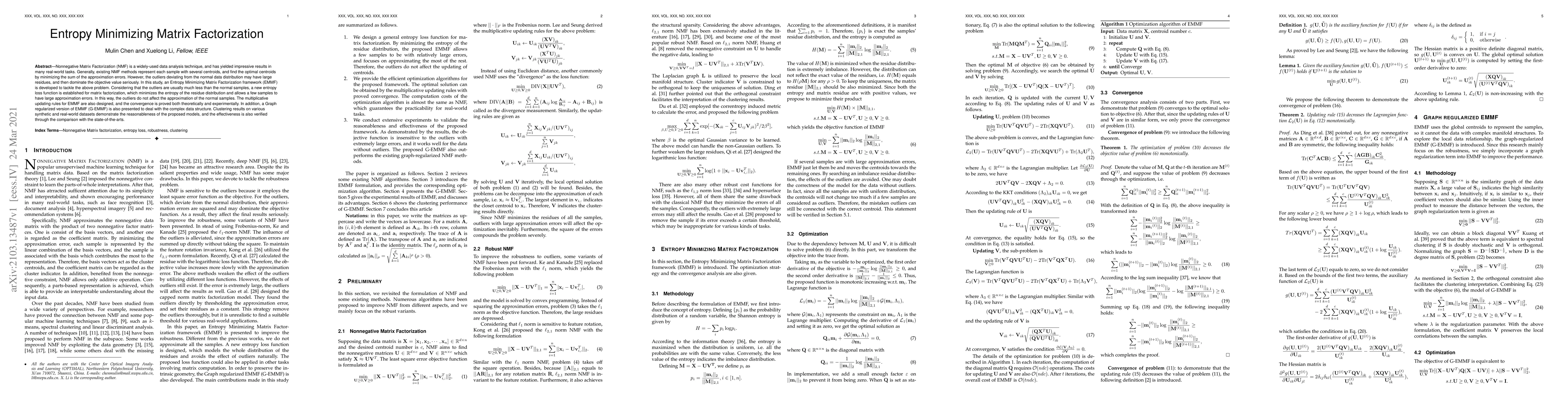This paper introduces Entropy Minimizing Matrix Factorization (EMMF), a new method for data analysis that minimizes entropy loss to handle outliers in nonnegative matrix factorization, achieving better clustering results than existing methods.