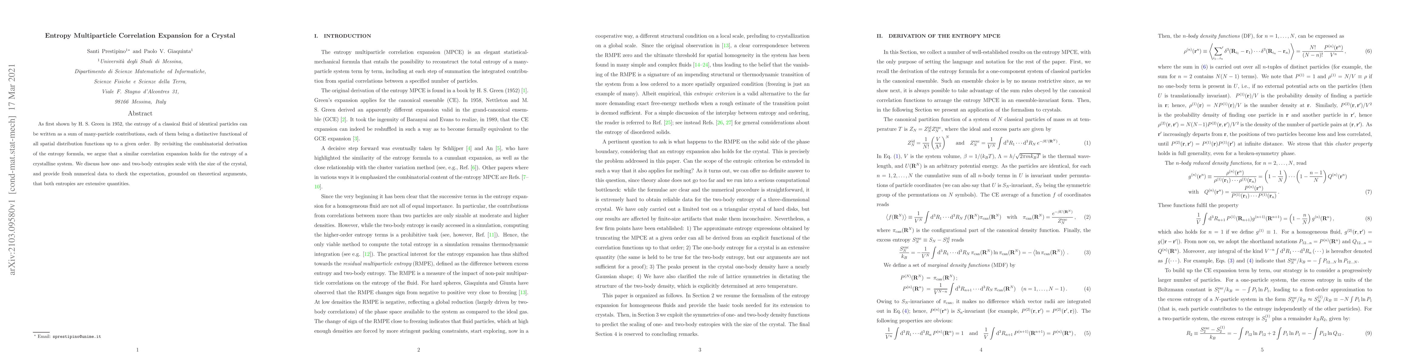 This paper revisits H.S. Green's 1952 concept, applying it to crystalline systems. It demonstrates that crystalline entropy can be expressed as a sum of many-particle contributions, similar to classical fluids. The study also provides new numerical data, supporting the extensive nature of one- and two-body entropies in crystals.