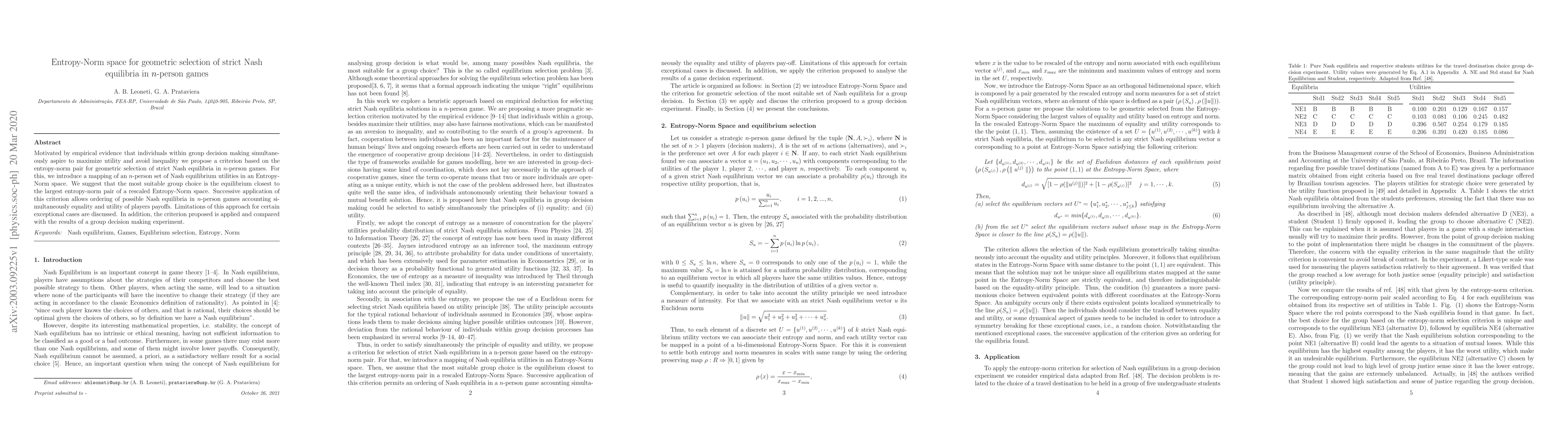 Motivated by empirical evidence that individuals within group decision making simultaneously aspire to maximize utility and avoid inequality we propose a criterion based on the entropy-norm pair for geometric selection of strict Nash equilibria in n-person games. For this, we introduce a mapping of an n-person set of Nash equilibrium utilities in an Entropy-Norm space. We suggest that the most suitable group choice is the equilibrium closest to the largest entropy-norm pair of a rescaled Entropy-Norm space. Successive application of this criterion permits an ordering of the possible Nash equilibria in an n-person game accounting simultaneously equality and utility of players payoffs. Limitations of this approach for certain exceptional cases are discussed. In addition, the criterion proposed is applied and compared with the results of a group decision making experiment.