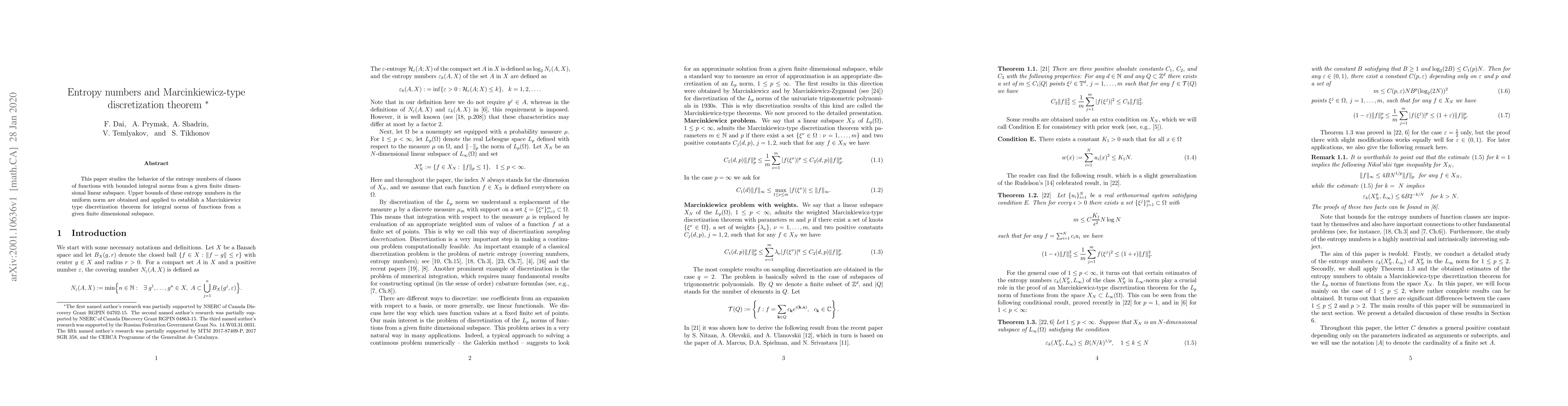 This paper studies the behavior of the entropy numbers of classes of functions with bounded integral norms from a given finite dimensional linear subspace. Upper bounds of these entropy numbers in the uniform norm are obtained and applied to establish a Marcinkiewicz type discretization theorem for integral norms of functions from a given finite dimensional subspace.