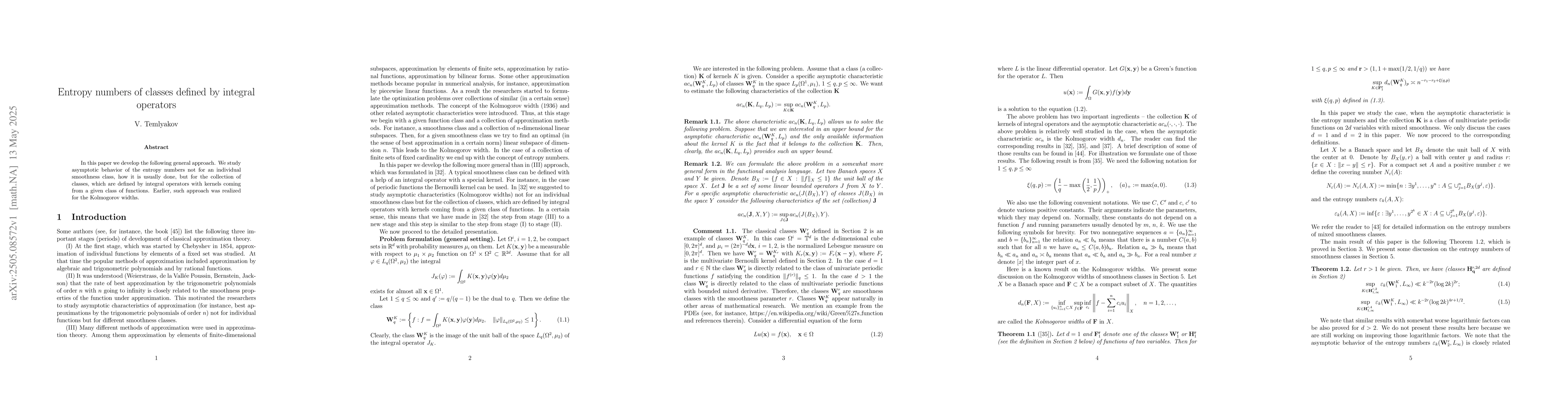 The paper presents a generalized approach for analyzing entropy numbers of classes defined by integral operators, extending previous work on Kolmogorov widths.