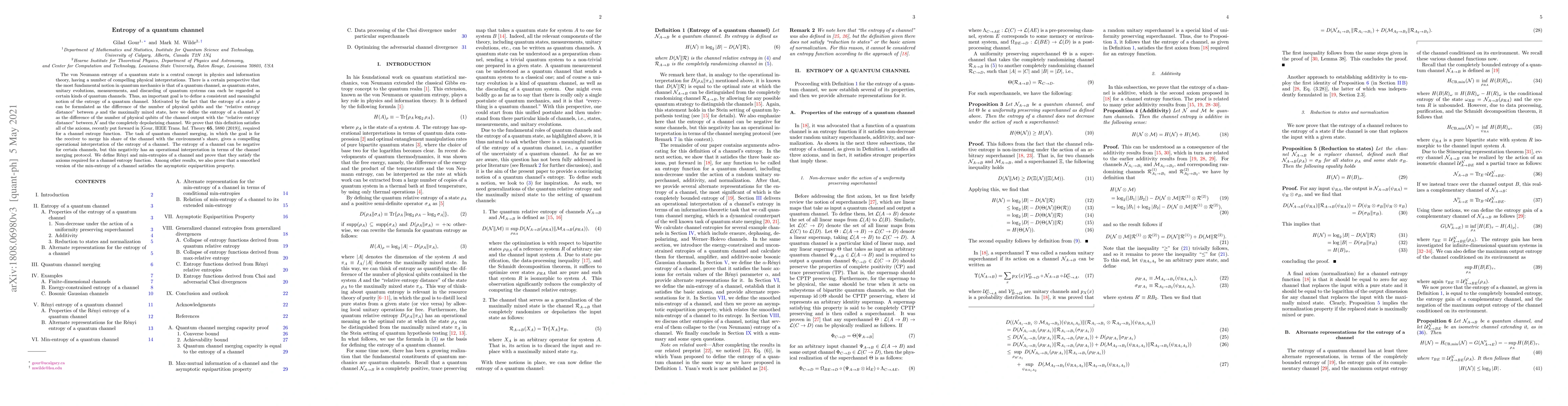 The von Neumann entropy of a quantum state is a central concept in physics and information theory, having a number of compelling physical interpretations. There is a certain perspective that the most fundamental notion in quantum mechanics is that of a quantum channel, as quantum states, unitary evolutions, measurements, and discarding of quantum systems can each be regarded as certain kinds of quantum channels. Thus, an important goal is to define a consistent and meaningful notion of the entropy of a quantum channel. Motivated by the fact that the entropy of a state $\rho$ can be formulated as the difference of the number of physical qubits and the "relative entropy distance" between $\rho$ and the maximally mixed state, here we define the entropy of a channel $\mathcal{N}$ as the difference of the number of physical qubits of the channel output with the "relative entropy distance" between $\mathcal{N}$ and the completely depolarizing channel. We prove that this definition satisfies all of the axioms, recently put forward in [Gour, IEEE Trans. Inf. Theory 65, 5880 (2019)], required for a channel entropy function. The task of quantum channel merging, in which the goal is for the receiver to merge his share of the channel with the environment's share, gives a compelling operational interpretation of the entropy of a channel. The entropy of a channel can be negative for certain channels, but this negativity has an operational interpretation in terms of the channel merging protocol. We define Renyi and min-entropies of a channel and prove that they satisfy the axioms required for a channel entropy function. Among other results, we also prove that a smoothed version of the min-entropy of a channel satisfies the asymptotic equipartition property.