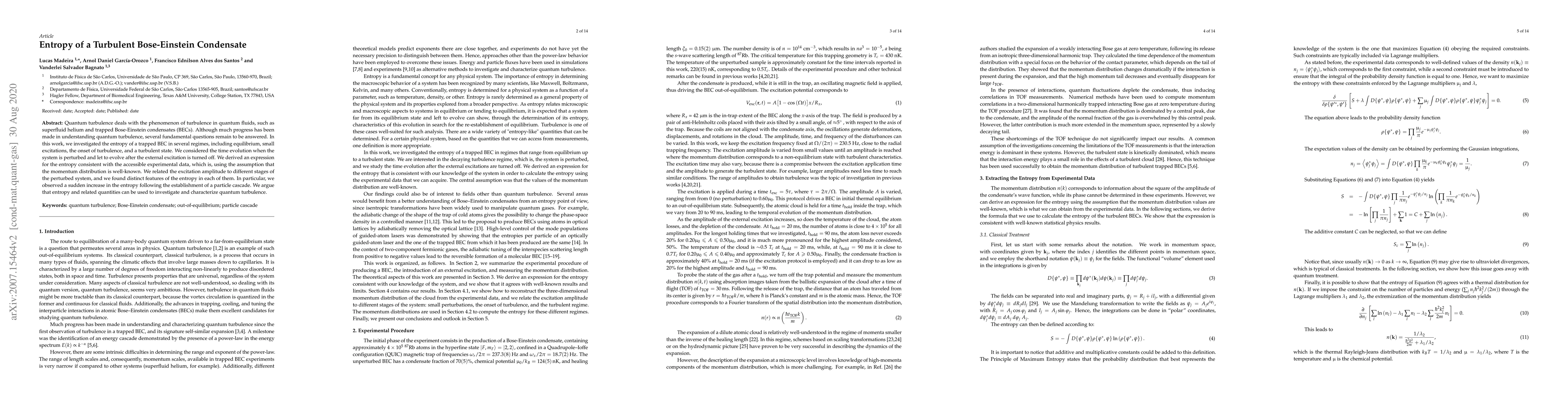 Quantum turbulence deals with the phenomenon of turbulence in quantum fluids, such as superfluid helium and trapped Bose-Einstein condensates (BECs). Although much progress has been made in understanding quantum turbulence, several fundamental questions remain to be answered. In this work, we investigated the entropy of a trapped BEC in several regimes, including equilibrium, small excitations, the onset of turbulence, and a turbulent state. We considered the time evolution when the system is perturbed and let to evolve after the external excitation is turned off. We derived an expression for the entropy consistent with the accessible experimental data, that is, using the assumption that the momentum distribution is well-known. We related the excitation amplitude to different stages of the perturbed system, and we found distinct features of the entropy in each of them. In particular, we observed a sudden increase in the entropy following the establishment of a particle cascade. We argue that entropy and related quantities can be used to investigate and characterize quantum turbulence.