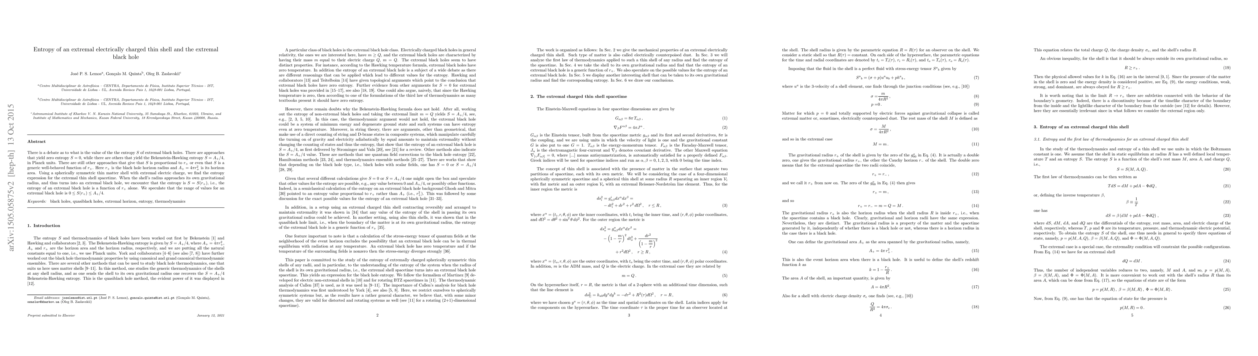 This paper investigates the entropy of extremal black holes, finding that the entropy $S$ is a function of the horizon radius $r_+$ alone, ranging from $0$ to $A_+/4$ in Planck units, based on the analysis of an extremal electrically charged thin shell.