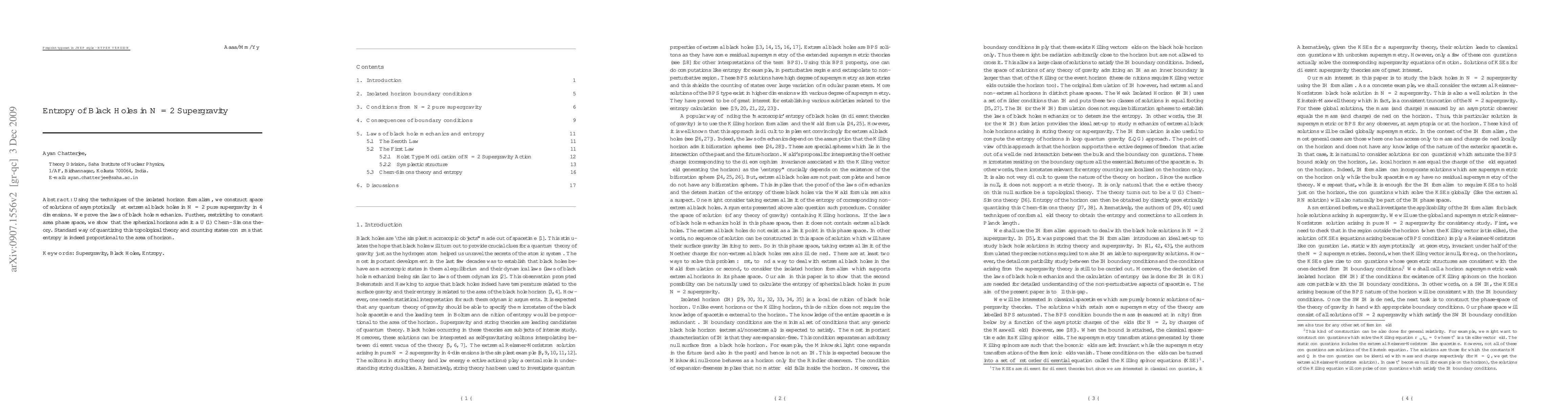Using the techniques of isolated horizon formalism, we construct the space of solutions of asymptotically flat extremal black holes in N=2 pure supergravity in 4 dimensions. We prove the laws of black hole mechanics. Further, restricting to constant area phase space, we show that the spherical horizons admits a U(1) Chern- Simons theory. Standard way of quantizing this topological theory and counting states confirms that entropy is indeed proportional to the area of horizon.