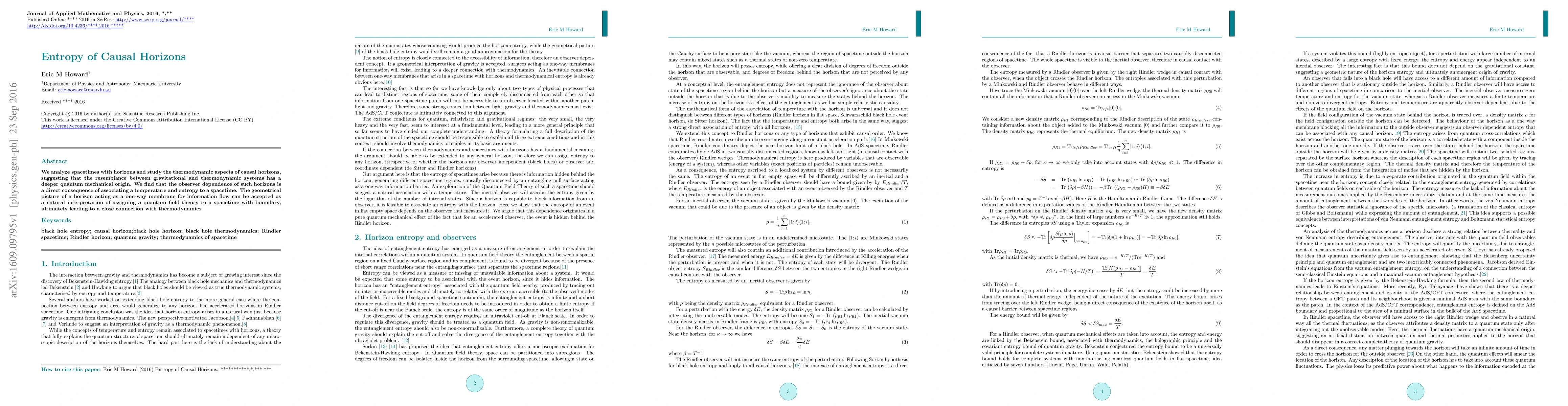 We analyze spacetimes with horizons and study the thermodynamic aspects of causal horizons, suggesting that the resemblance between gravitational and thermodynamic systems has a deeper quantum mechanical origin. We find that the observer dependence of such horizons is a direct consequence of associating a temperature and entropy to a spacetime. The geometrical picture of a horizon acting as a one-way membrane for information flow can be accepted as a natural interpretation of assigning a quantum field theory to a spacetime with boundary, ultimately leading to a close connection with thermodynamics.