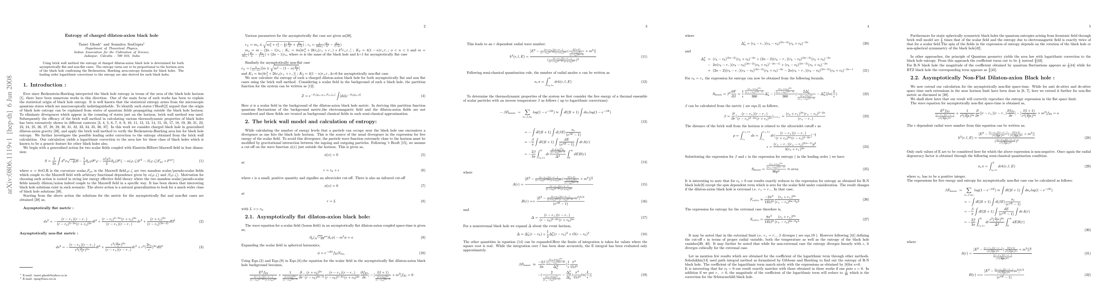 The paper determines the entropy of charged dilaton-axion black holes using the brick wall method, confirming the Bekenstein-Hawking area-entropy relation and deriving leading order logarithmic corrections for both asymptotically flat and non-flat cases.