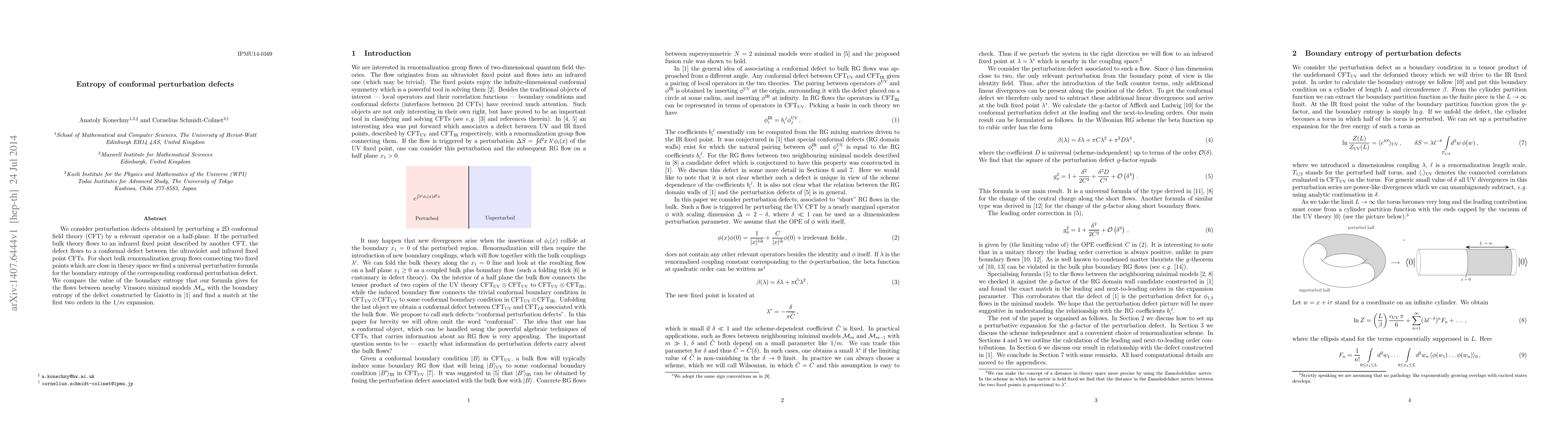 This paper explores the entropy of conformal perturbation defects in 2D CFTs, deriving a universal formula for the boundary entropy of defects arising from short bulk renormalization group flows between nearby fixed points. The results match Gaiotto's construction for Virasoro minimal models up to the first two orders in the 1/m expansion.
