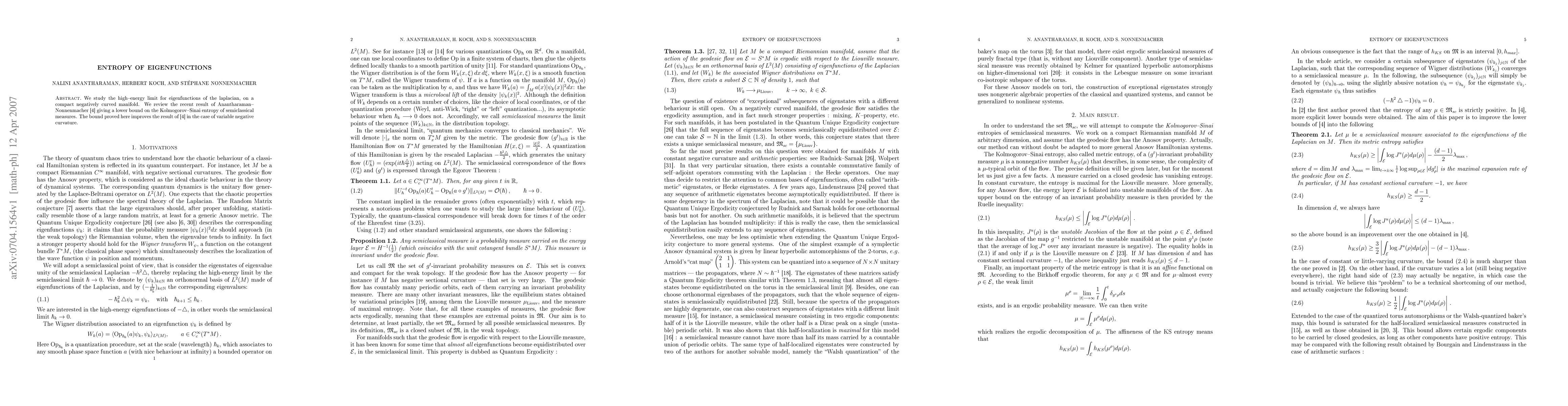 We study the high--energy limit for eigenfunctions of the laplacian, on a compact negatively curved manifold. We review the recent result of Anantharaman-Nonnenmacher giving a lower bound on the Kolmogorov-Sinai entropy of semiclassical measures, and improve this lower bound in the case of variable negative curvature.