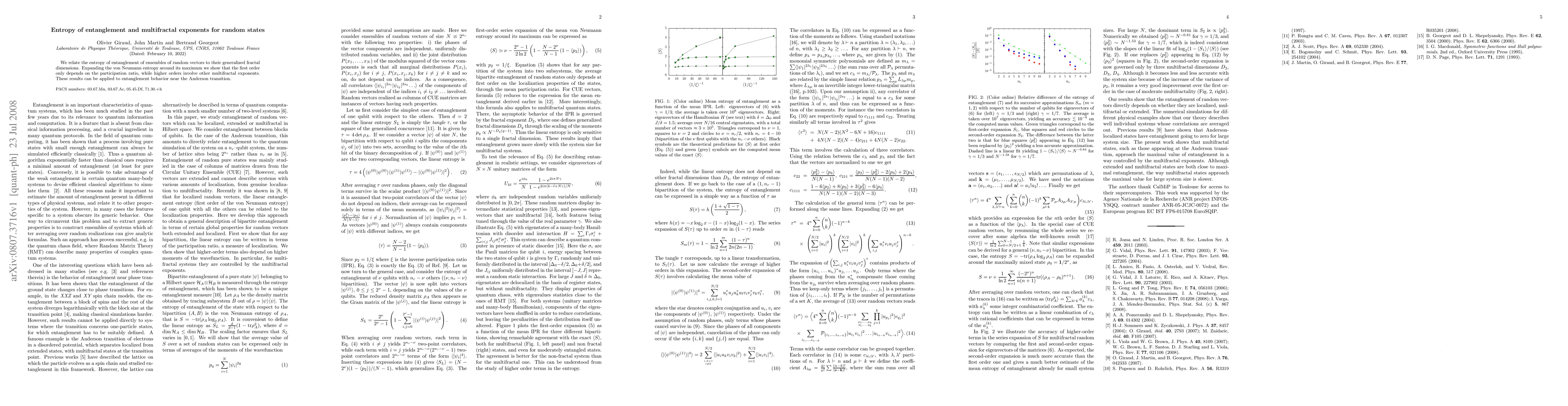 We relate the entropy of entanglement of ensembles of random vectors to their generalized fractal dimensions. Expanding the von Neumann entropy around its maximum we show that the first order only depends on the participation ratio, while higher orders involve other multifractal exponents. These results can be applied to entanglement behavior near the Anderson transition.