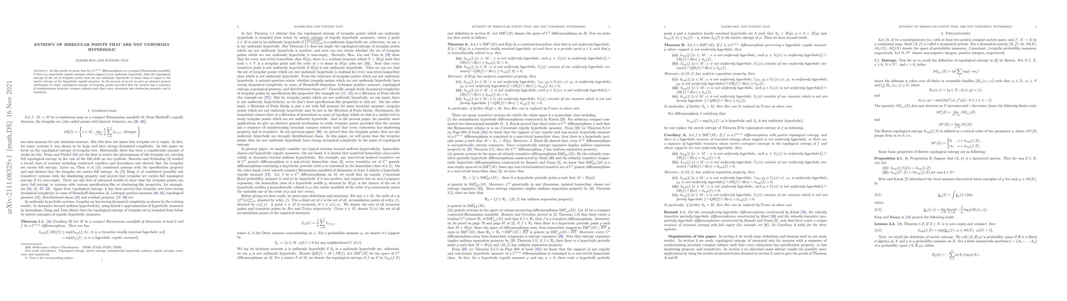 This paper proves that the topological entropy of irregular points in a $C^{1+\alpha}$ diffeomorphism on a compact Riemannian manifold, where the support of a hyperbolic ergodic measure is not uniformly hyperbolic, is greater than or equal to the metric entropy of the hyperbolic ergodic measure. It also introduces a general method to study topological entropy in systems with nondecreasing invariant compact subsets and transitive subsystems.