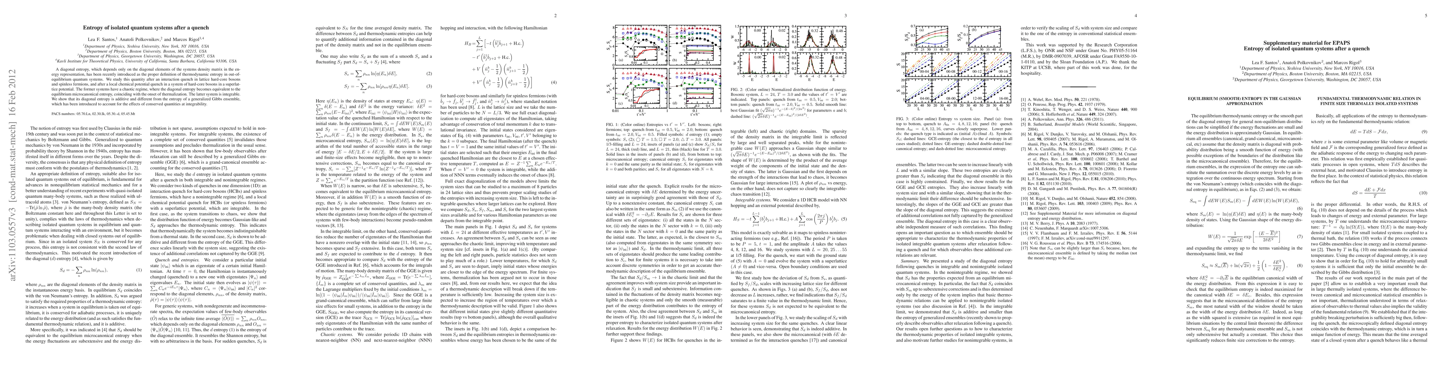 The study investigates the entropy of isolated quantum systems after a quench, focusing on diagonal entropy in energy representation for both non-integrable (chaotic) and integrable systems.