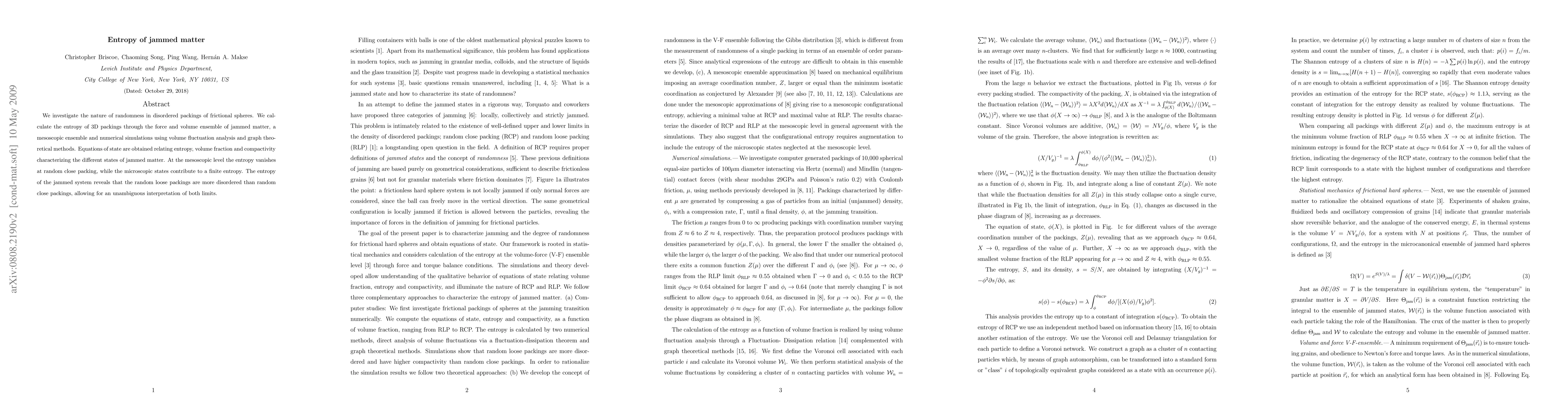 This paper investigates the entropy of disordered packings of frictional spheres, revealing that random loose packings are more disordered than random close packings. It uses numerical simulations and graph theoretical methods to derive equations of state relating entropy, volume fraction, and compactivity in jammed matter.