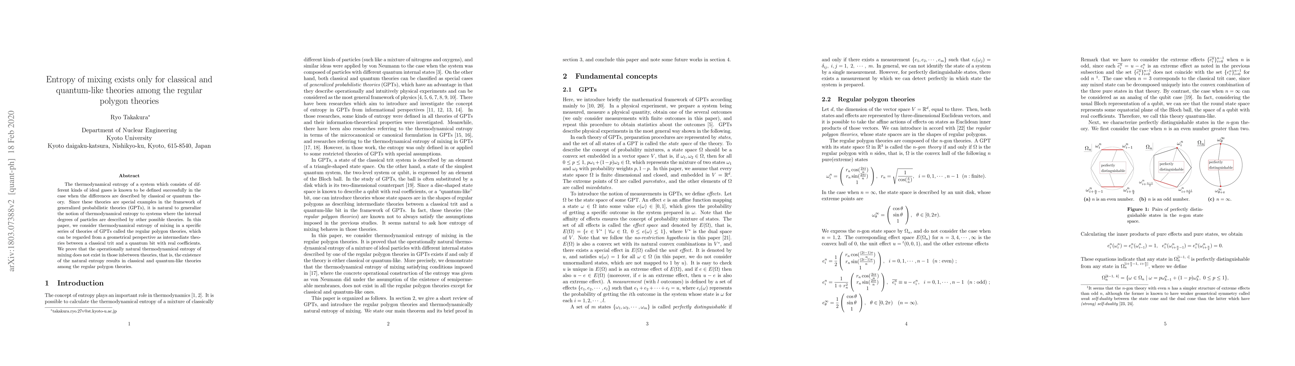 This paper explores the thermodynamical entropy of mixing within regular polygon theories, a subset of generalized probabilistic theories (GPTs). It concludes that entropy of mixing exists only in classical and quantum-like theories, not in the intermediate regular polygon theories.