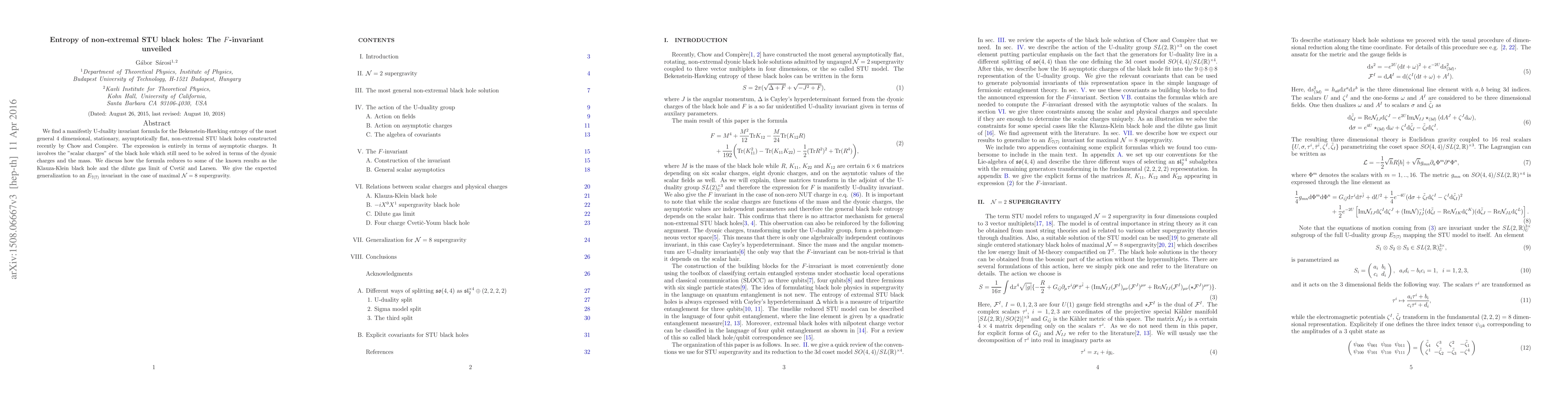 This paper presents a U-duality invariant formula for the entropy of non-extremal STU black holes, expressed solely in terms of asymptotic charges. The formula generalizes known results and anticipates an $E_{7(7)}$ invariant for maximal $\mathcal{N}=8$ supergravity.