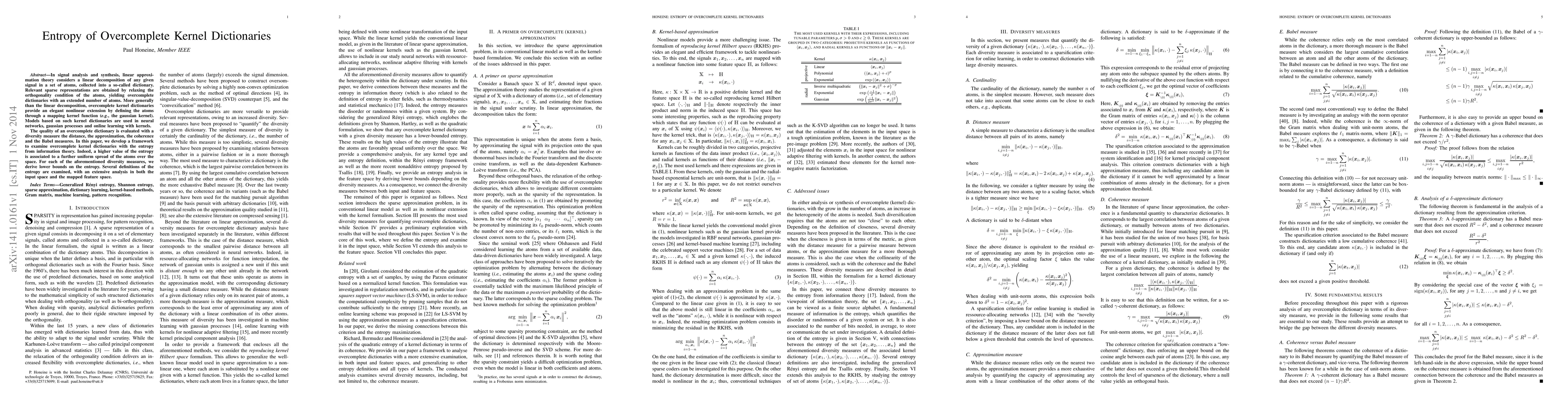 In signal analysis and synthesis, linear approximation theory considers a linear decomposition of any given signal in a set of atoms, collected into a so-called dictionary. Relevant sparse representations are obtained by relaxing the orthogonality condition of the atoms, yielding overcomplete dictionaries with an extended number of atoms. More generally than the linear decomposition, overcomplete kernel dictionaries provide an elegant nonlinear extension by defining the atoms through a mapping kernel function (e.g., the gaussian kernel). Models based on such kernel dictionaries are used in neural networks, gaussian processes and online learning with kernels. The quality of an overcomplete dictionary is evaluated with a diversity measure the distance, the approximation, the coherence and the Babel measures. In this paper, we develop a framework to examine overcomplete kernel dictionaries with the entropy from information theory. Indeed, a higher value of the entropy is associated to a further uniform spread of the atoms over the space. For each of the aforementioned diversity measures, we derive lower bounds on the entropy. Several definitions of the entropy are examined, with an extensive analysis in both the input space and the mapped feature space.