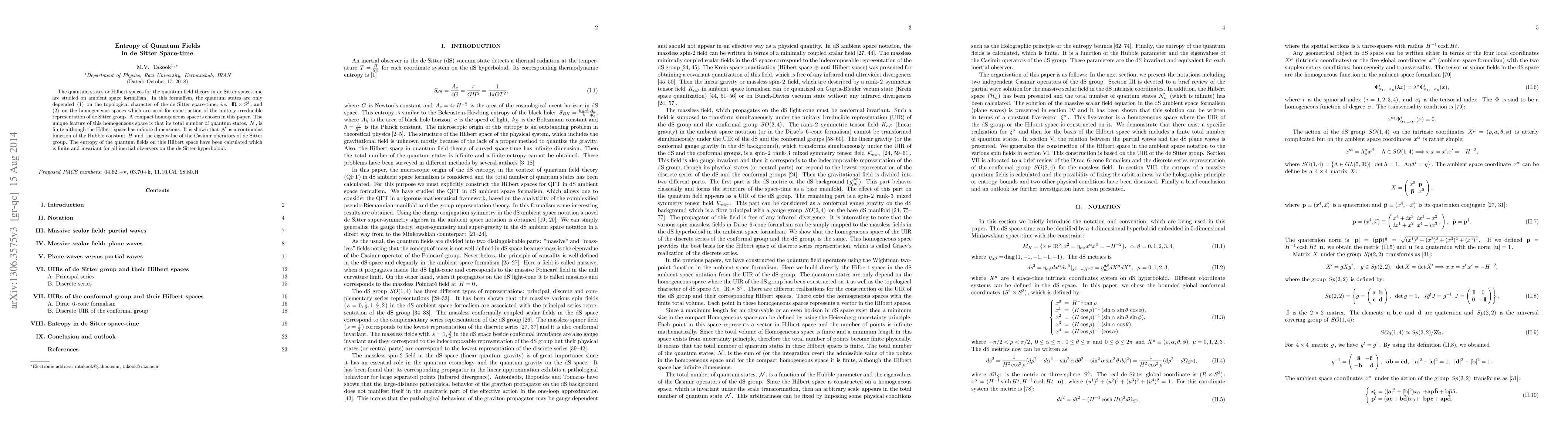 This paper studies quantum fields in de Sitter space-time using the ambient space formalism, revealing that the number of quantum states is finite despite infinite Hilbert space dimensions. The entropy of these quantum fields is shown to be finite and observer-invariant.