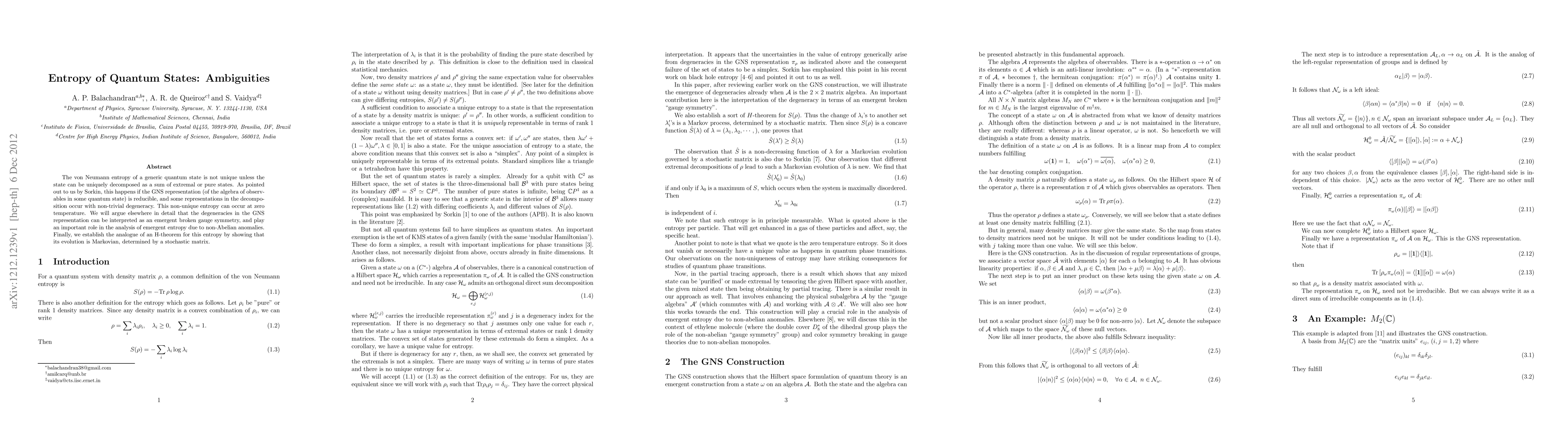 The von Neumann entropy of a generic quantum state is not unique unless the state can be uniquely decomposed as a sum of extremal or pure states. As pointed out to us by Sorkin, this happens if the GNS representation (of the algebra of observables in some quantum state) is reducible, and some representations in the decomposition occur with non-trivial degeneracy. This non-unique entropy can occur at zero temperature. We will argue elsewhere in detail that the degeneracies in the GNS representation can be interpreted as an emergent broken gauge symmetry, and play an important role in the analysis of emergent entropy due to non-Abelian anomalies. Finally, we establish the analogue of an H-theorem for this entropy by showing that its evolution is Markovian, determined by a stochastic matrix.