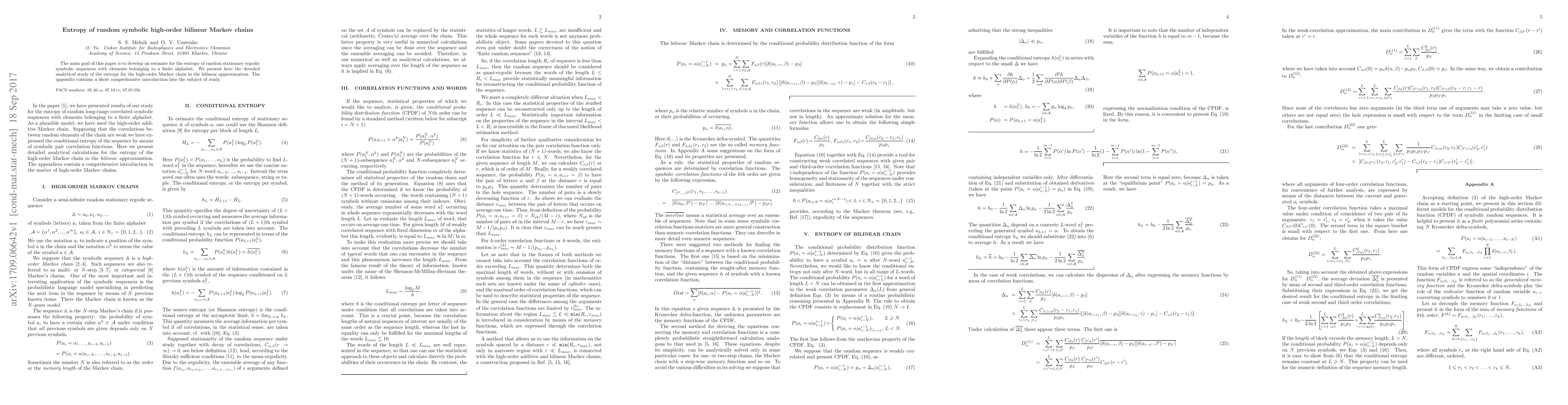 The main goal of this paper is to develop an estimate for the entropy of random stationary ergodic symbolic sequences with elements belonging to a finite alphabet. We present here the detailed analytical study of the entropy for the high-order Markov chain in the bilinear approximation. The appendix contains a short comprehensive introduction into the subject of study.