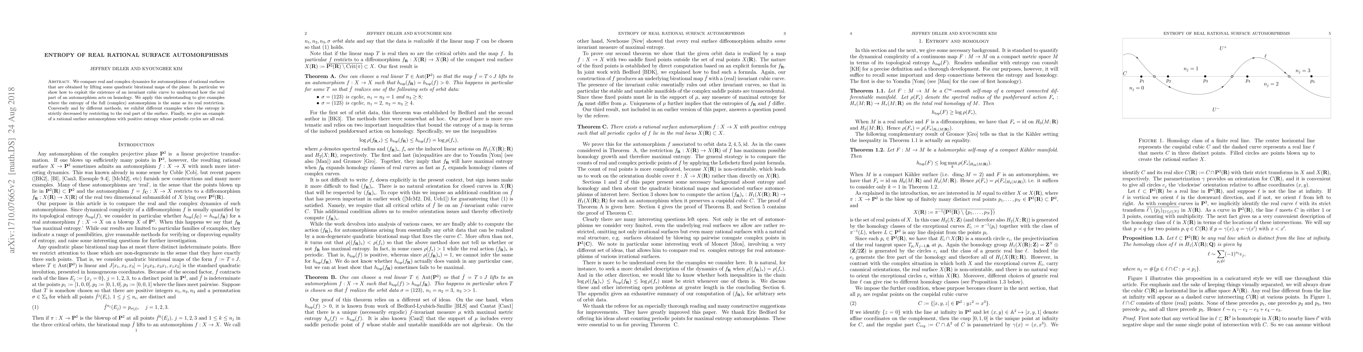 This paper compares real and complex dynamics of rational surface automorphisms derived from quadratic birational maps, demonstrating how an invariant cubic curve influences the real part's action on homology. It finds instances where complex and real entropy match and others where real restriction decreases entropy, concluding with an example of a positive entropy automorphism having all real periodic cycles.