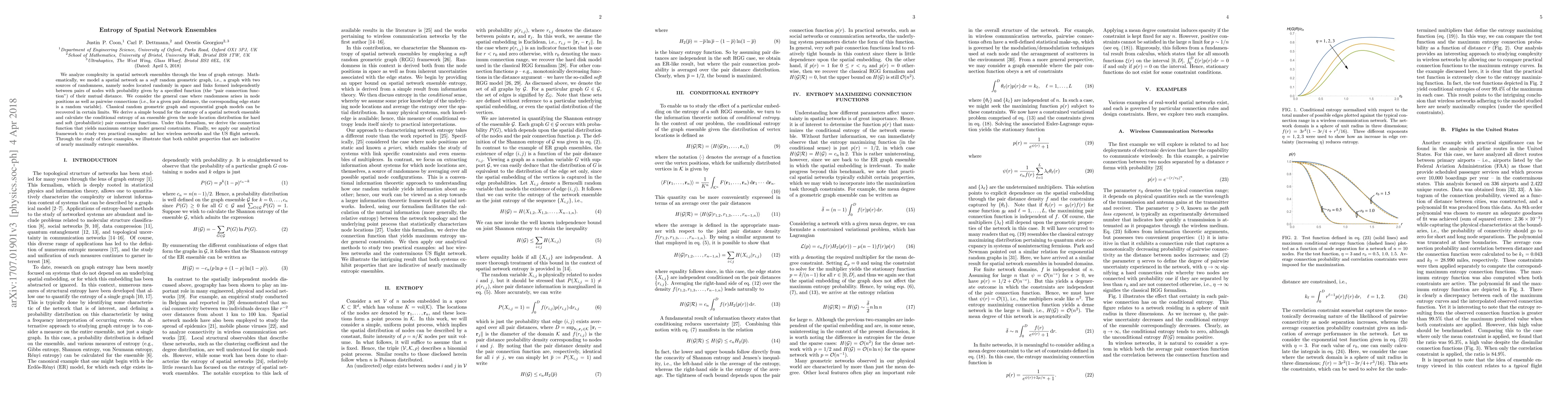 This paper investigates the complexity of spatial network ensembles using graph entropy, modeling networks as soft random geometric graphs with random node positions and probabilistic links. It derives bounds for entropy and identifies the connection function that maximizes entropy under constraints, applying the framework to ad hoc wireless networks and the US flight network, which both show nearly maximal entropic properties.
