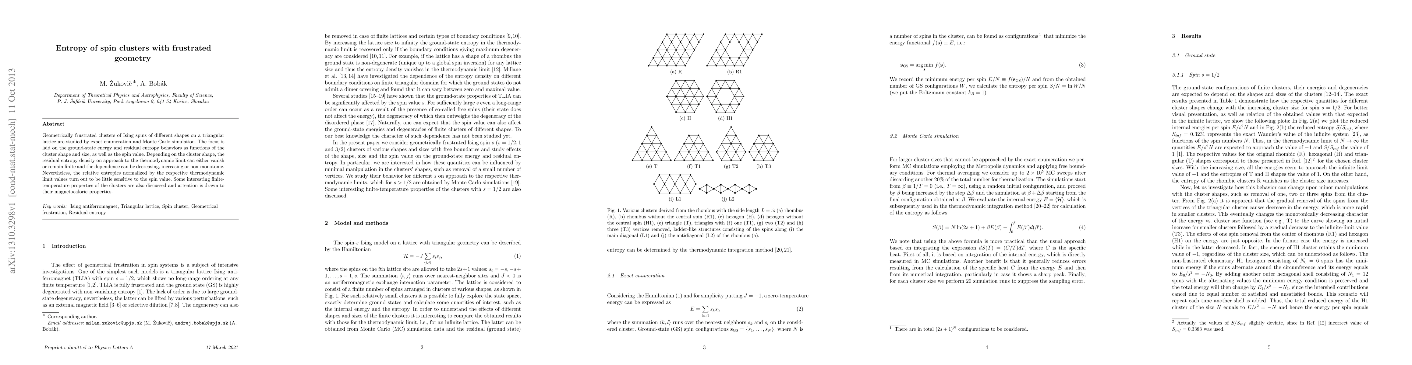 Geometrically frustrated clusters of Ising spins of different shapes on a triangular lattice are studied by exact enumeration and Monte Carlo simulation. The focus is laid on the ground-state energy and residual entropy behaviors as functions of the cluster shape and size, as well as the spin value. Depending on the cluster shape, the residual entropy density on approach to the thermodynamic limit can either vanish or remain finite and the dependence can be decreasing, increasing or non-monotonic. Nevertheless, the relative entropies normalized by the respective thermodynamic limit values turn out to be little sensitive to the spin value. Some interesting finite-temperature properties of the clusters are also discussed and attention is drawn to their magnetocaloric properties.