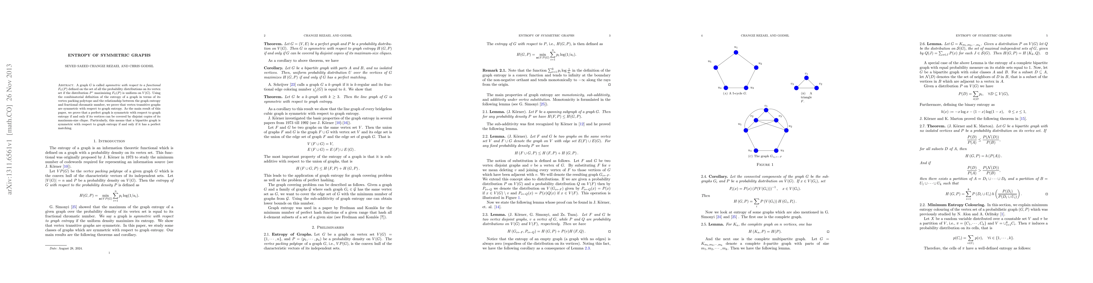 A graph $G$ is called \emph{symmetric with respect to a functional $F_G(P)$} defined on the set of all the probability distributions on its vertex set if the distribution $P^*$ maximizing $F_G(P)$ is uniform on $V(G)$. Using the combinatorial definition of the entropy of a graph in terms of its vertex packing polytope and the relationship between the graph entropy and fractional chromatic number, we prove that vertex transitive graphs are symmetric with respect to graph entropy. As the main result of this paper, we prove that a perfect graph is symmetric with respect to graph entropy if and only if its vertices can be covered by disjoint copies of its maximum-size clique. Particularly, this means that a bipartite graph is symmetric with respect to graph entropy if and only if it has a perfect matching.