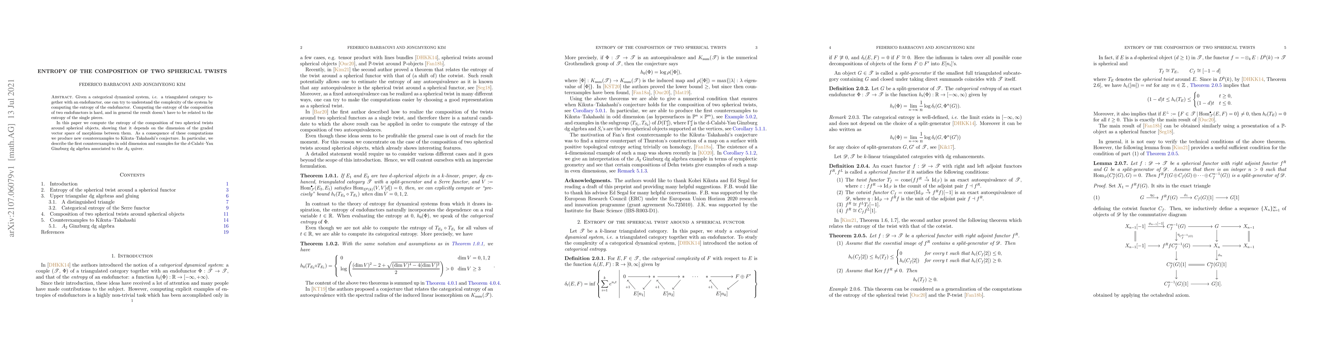 This paper computes the entropy of the composition of two spherical twists in a categorical dynamical system, revealing its dependence on the dimension of the graded vector space of morphisms. It also provides new counterexamples to Kikuta-Takahashi's conjecture, including the first in odd dimensions and for the $d$-Calabi-Yau Ginzburg dg algebra associated with the $A_2$ quiver.
