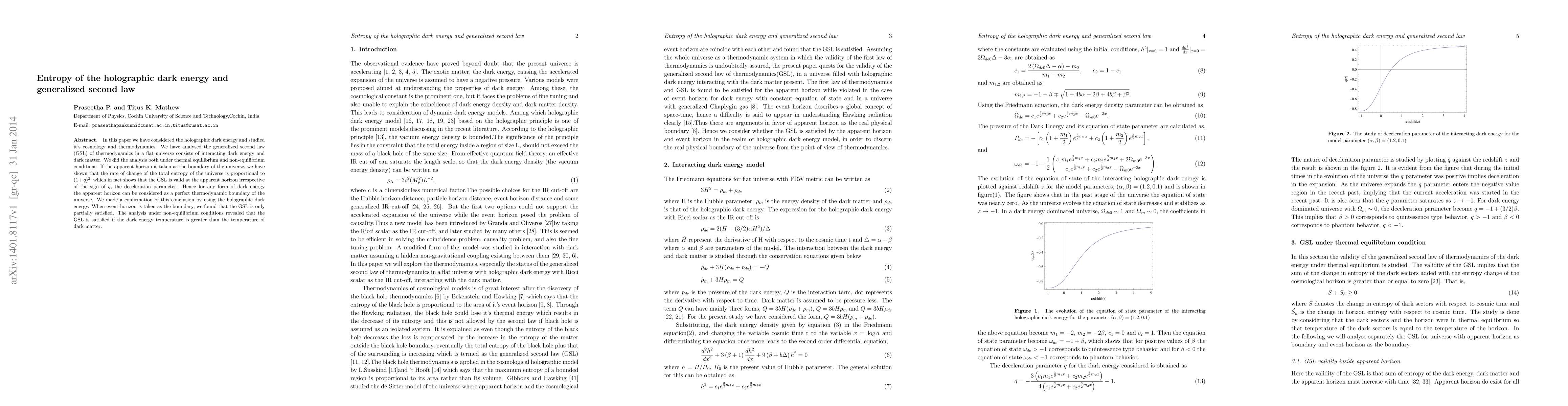 This paper explores the thermodynamics of holographic dark energy in a flat universe, confirming that the generalized second law of thermodynamics holds at the apparent horizon regardless of the deceleration parameter. Under non-equilibrium conditions, the law is satisfied when dark energy temperature exceeds dark matter temperature.