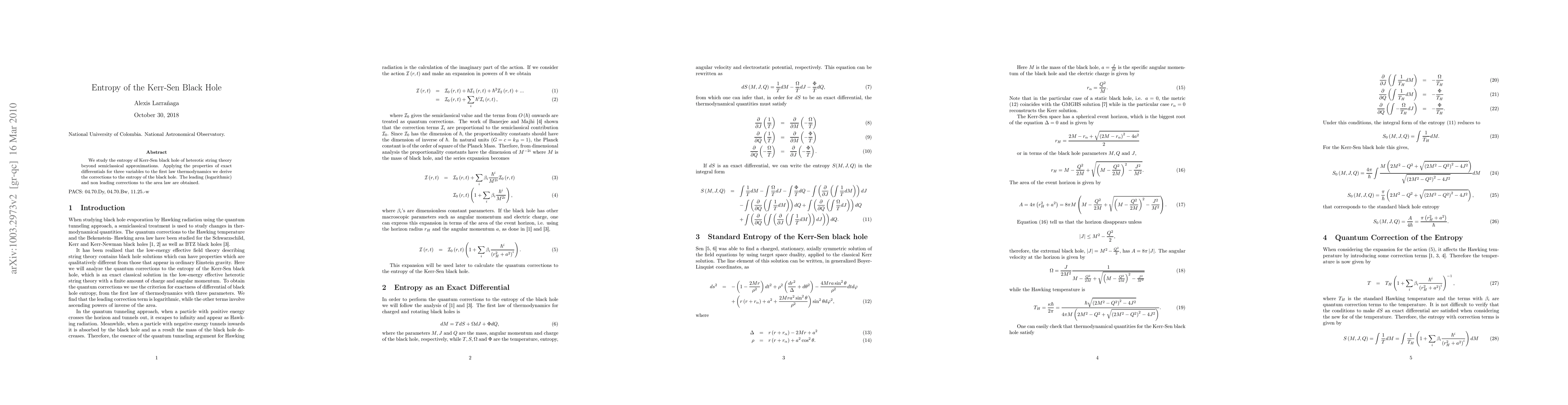 This paper investigates the entropy of Kerr-Sen black holes in heterotic string theory, moving beyond semiclassical approximations. It derives corrections to the black hole entropy using exact differentials and thermodynamics, obtaining both leading logarithmic and non-leading corrections to the area law.