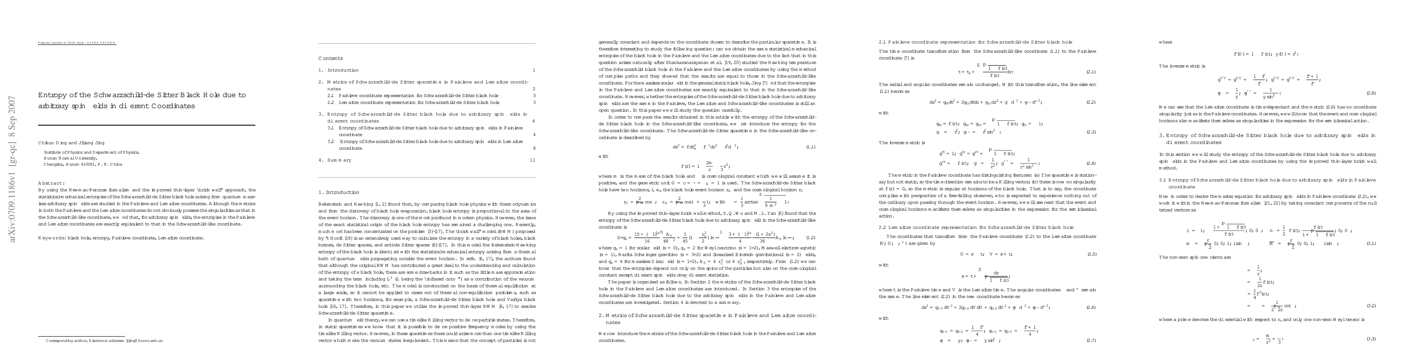 By using the Newman-Penrose formalism and the improved thin-layer ``brick wall'' approach, the statistical-mechanical entropies of the Schwarzschild-de Sitter black hole arising from quantum massless arbitrary spin fields are studied in the Painlev\'e and Lemaitre coordinates. Although the metrics in both the Painlev\'e and the Lemaitre coordinates do not obviously possess the singularities as that in the Schwarzschild-like coordinate, we find that, for arbitrary spin fields, the entropies in the Painlev\'e and Lemaitre coordinates are exactly equivalent to that in the Schwarzschild-like coordinate.