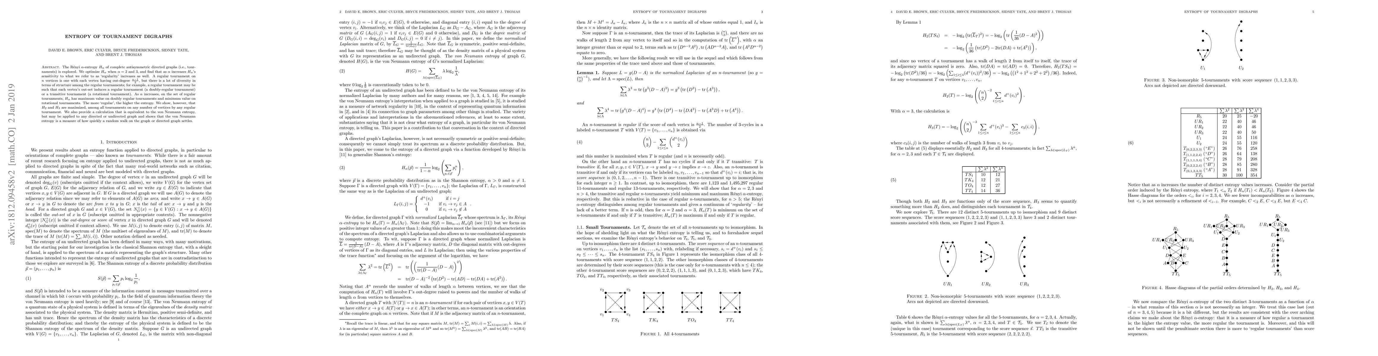 The R\'{e}nyi $\alpha$-entropy $H_{\alpha}$ of complete antisymmetric directed graphs (i.e., tournaments) is explored. We optimize $H_{\alpha}$ when $\alpha = 2$ and $3$, and find that as $\alpha$ increases $H_{\alpha}$'s sensitivity to what we refer to as `regularity' increases as well. A regular tournament on $n$ vertices is one with each vertex having out-degree $\frac{n-1}{2}$, but there is a lot of diversity in terms of structure among the regular tournaments; for example, a regular tournament may be such that each vertex's out-set induces a regular tournament (a doubly-regular tournament) or a transitive tournament (a rotational tournament). As $\alpha$ increases, on the set of regular tournaments, $H_{\alpha}$ has maximum value on doubly regular tournaments and minimum value on rotational tournaments. The more `regular', the higher the entropy. We show, however, that $H_2$ and $H_3$ are maximized, among all tournaments on any number of vertices by any regular tournament. We also provide a calculation that is equivalent to the von Neumann entropy, but may be applied to any directed or undirected graph and shows that the von Neumann entropy is a measure of how quickly a random walk on the graph or directed graph settles.