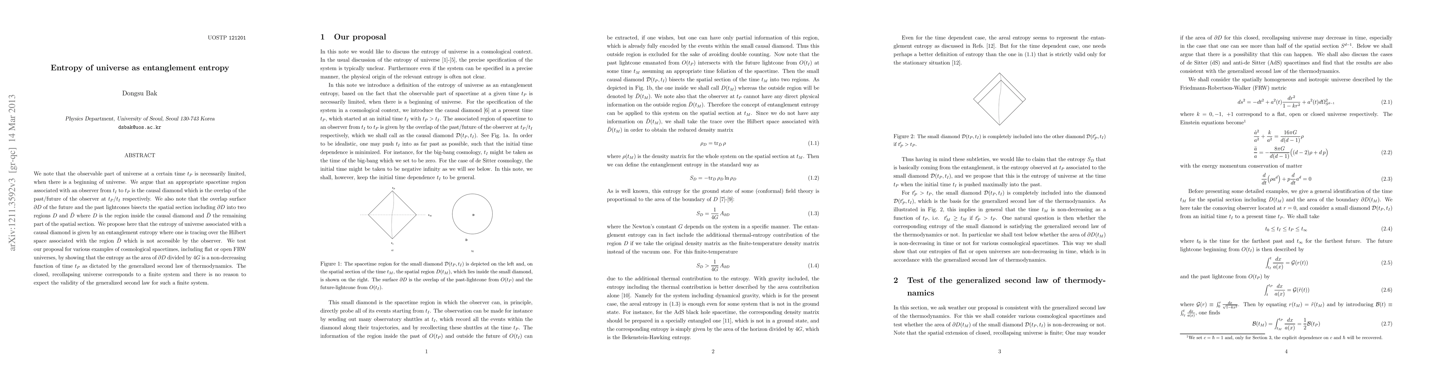 We note that the observable part of universe at a certain time t_P is necessarily limited, when there is a beginning of universe. We argue that an appropriate spacetime region associated with an observer from tI to t_P is the causal diamond which is the overlap of the past/future of the observer at t_P/t_I respectively. We also note that the overlap surface \partial D of the future and the past lightcones bisects the spatial section including \partial D into two regions D and \bar D where D is the region inside the causal diamond and \bar D the remaining part of the spatial section. We propose here that the entropy of universe associated with a causal diamond is given by an entanglement entropy where one is tracing over the Hilbert space associated with the region \bar D which is not accessible by the observer. We test our proposal for various examples of cosmological spacetimes, including flat or open FRW universes, by showing that the entropy as the area of \partial D divided by 4G is a non-decreasing function of time t_P as dictated by the generalized second law of thermodynamics. The closed, recollapsing universe corresponds to a finite system and there is no reason to expect the validity of the generalized second law for such a finite system.