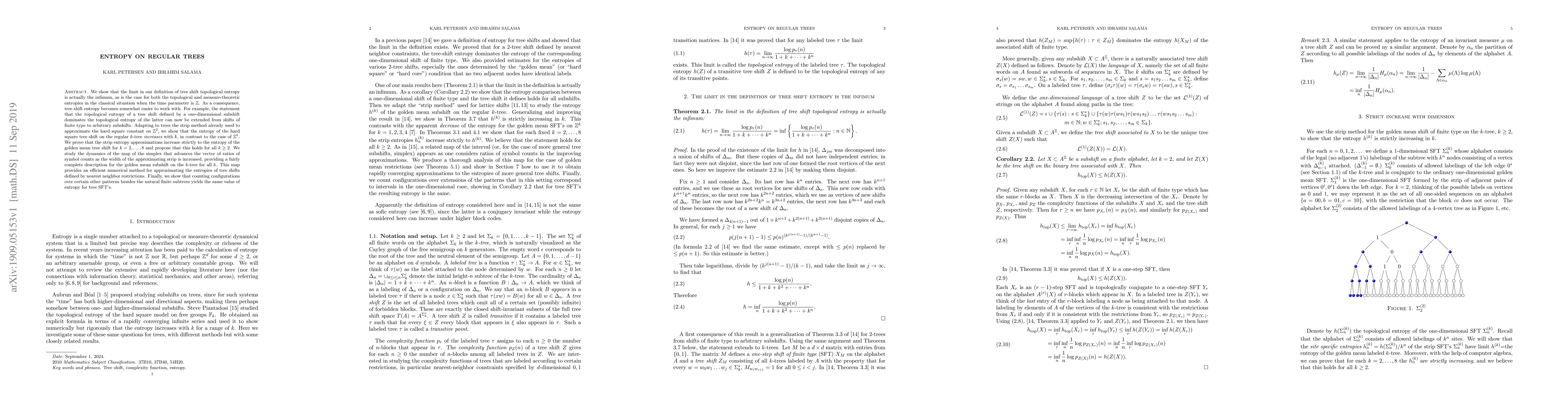 We show that the limit in our definition of tree shift topological entropy is actually the infimum, as is the case for both the topological and measure-theoretic entropies in the classical situation when the time parameter is $\mathbb Z$. As a consequence, tree shift entropy becomes somewhat easier to work with. For example, the statement that the topological entropy of a tree shift defined by a one-dimensional subshift dominates the topological entropy of the latter can now be extended from shifts of finite type to arbitrary subshifts. Adapting to trees the strip method already used to approximate the hard square constant on $\mathbb Z^2$, we show that the entropy of the hard square tree shift on the regular $k$-tree increases with $k$, in contrast to the case of $\mathbb Z^k$. We prove that the strip entropy approximations increase strictly to the entropy of the golden mean tree shift for $k=2,\dots,8$ and propose that this holds for all $k \geq 2$. We study the dynamics of the map of the simplex that advances the vector of ratios of symbol counts as the width of the approximating strip is increased, providing a fairly complete description for the golden mean subshift on the $k$-tree for all $k$. This map provides an efficient numerical method for approximating the entropies of tree shifts defined by nearest neighbor restrictions. Finally, we show that counting configurations over certain other patterns besides the natural finite subtrees yields the same value of entropy for tree SFT's.