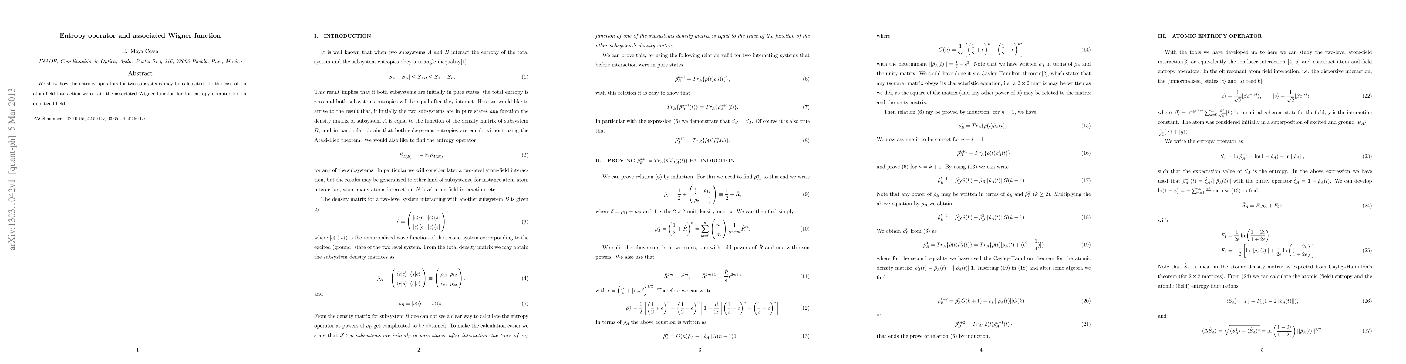 Researchers develop a method to calculate entropy operators for two subsystems, including an associated Wigner function for atom-field interactions.