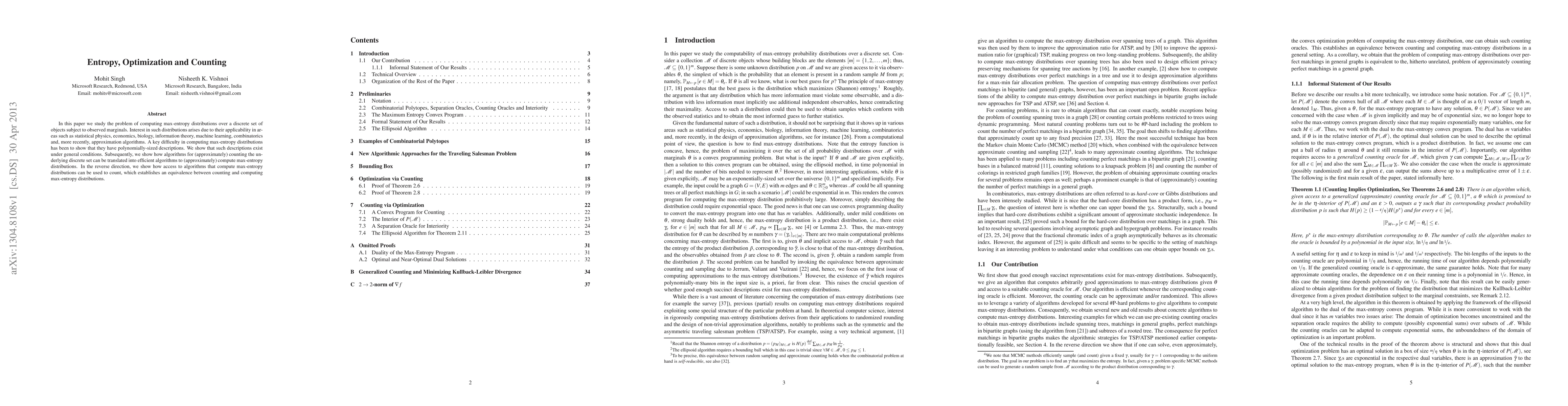 In this paper we study the problem of computing max-entropy distributions over a discrete set of objects subject to observed marginals. Interest in such distributions arises due to their applicability in areas such as statistical physics, economics, biology, information theory, machine learning, combinatorics and, more recently, approximation algorithms. A key difficulty in computing max-entropy distributions has been to show that they have polynomially-sized descriptions. We show that such descriptions exist under general conditions. Subsequently, we show how algorithms for (approximately) counting the underlying discrete set can be translated into efficient algorithms to (approximately) compute max-entropy distributions. In the reverse direction, we show how access to algorithms that compute max-entropy distributions can be used to count, which establishes an equivalence between counting and computing max-entropy distributions.