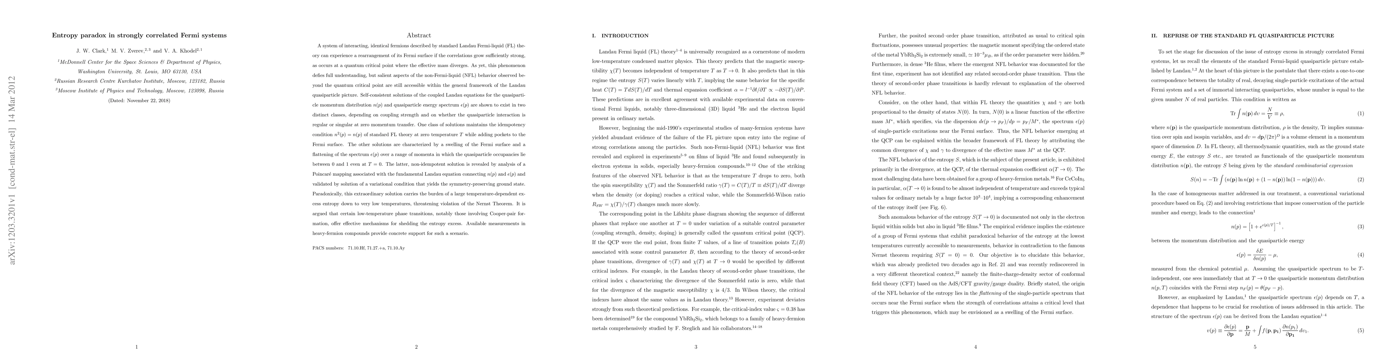 A system of interacting, identical fermions described by standard Landau Fermi-liquid (FL) theory can experience a rearrangement of its Fermi surface if the correlations grow sufficiently strong, as occurs at a quantum critical point where the effective mass diverges. As yet, this phenomenon defies full understanding, but salient aspects of the non-Fermi-liquid (NFL) behavior observed beyond the quantum critical point are still accessible within the general framework of the Landau quasiparticle picture. Self-consistent solutions of the coupled Landau equations for the quasiparticle momentum distribution $n(p)$ and quasiparticle energy spectrum $\epsilon(p)$ are shown to exist in two distinct classes, depending on coupling strength and on whether the quasiparticle interaction is regular or singular at zero momentum transfer. One class of solutions maintains the idempotency condition $n^2(p)=n(p)$ of standard FL theory at zero temperature $T$ while adding pockets to the Fermi surface. The other solutions are characterized by a swelling of the Fermi surface and a flattening of the spectrum $\epsilon(p)$ over a range of momenta in which the quasiparticle occupancies lie between 0 and 1 even at T=0. The latter, non-idempotent solution is revealed by analysis of a Poincar\'e mapping associated with the fundamental Landau equation connecting $n(p)$ and $\epsilon(p)$ and validated by solution of a variational condition that yields the symmetry-preserving ground state. Paradoxically, this extraordinary solution carries the burden of a large temperature-dependent excess entropy down to very low temperatures, threatening violation of the Nernst Theorem. It is argued that certain low-temperature phase transitions offer effective mechanisms for shedding the entropy excess. Available measurements in heavy-fermion compounds provide concrete support for such a scenario.